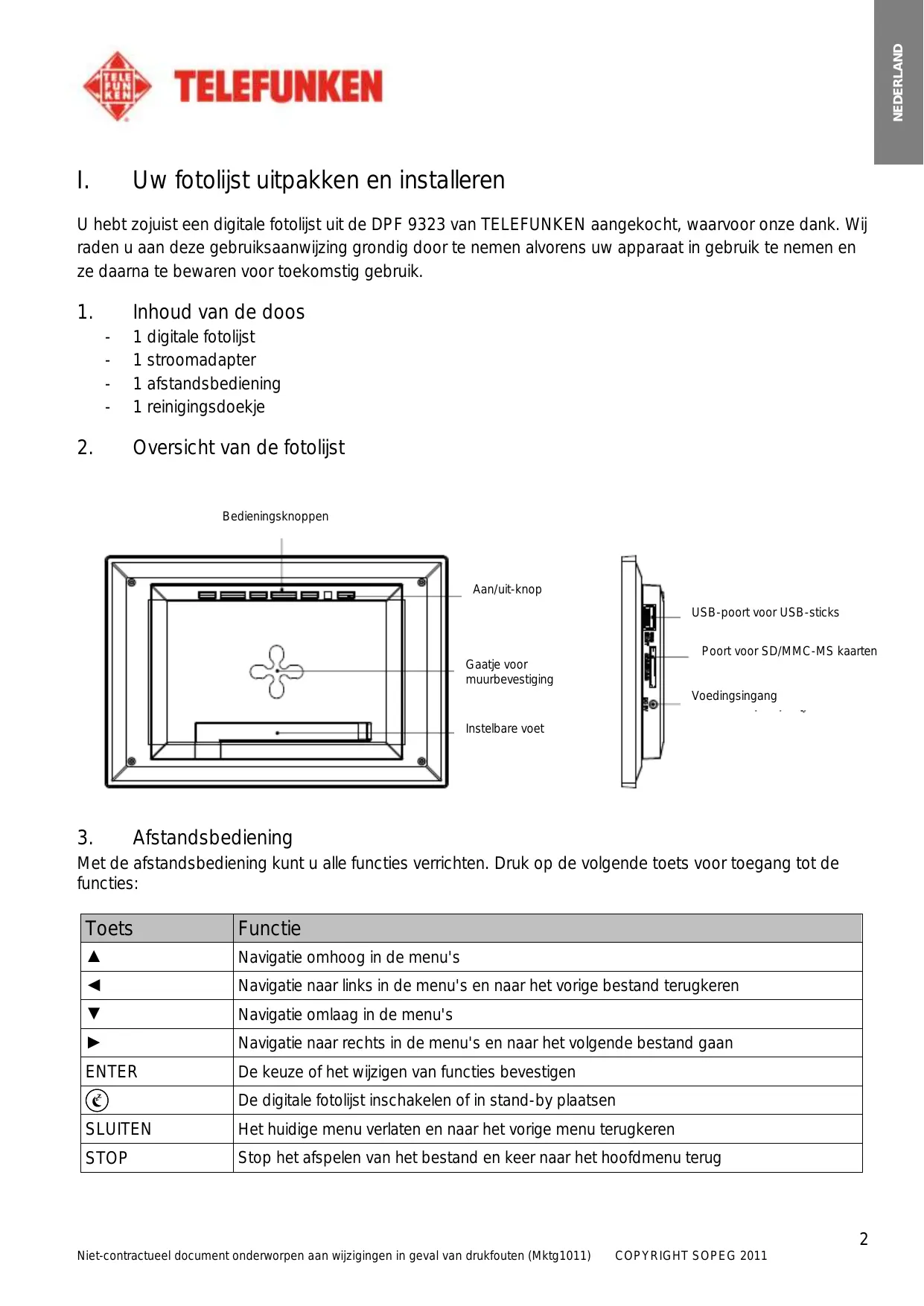 Uw fotolijst uitpakken en installeren U hebt zojuist een digitale fotolijst uit de DPF 9323 van TELEFUNKEN aangekocht, waarvoor onze dank. Wij raden u aan deze gebruiksaanwijzing grondig door te nemen alvorens uw apparaat in gebruik te nemen en ze daarna te bewaren voor toekomstig gebruik.