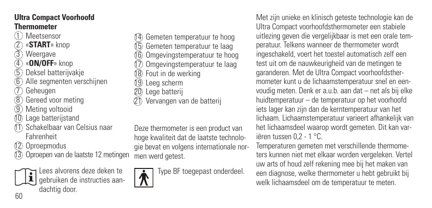 Lees alvorens deze deken te gebruiken de instructies aandachtig door. Met zijn unieke en klinisch geteste technologie kan de Ultra Compact voorhoofdsthermometer een stabiele uitlezing geven die vergelijkbaar is met een orale tem14 Gemeten temperatuur te hoog peratuur. Telkens wanneer de thermometer wordt 15 Gemeten temperatuur te laag ingeschakeld, voert het toestel automatisch zelf een 16 Omgevingstemperatuur te hoog test uit om de nauwkeurigheid van de metingen te 17 Omgevingstemperatuur te laag garanderen. Met de Ultra Compact voorhoofdsther18 Fout in de werking mometer kunt u de lichaamstemperatuur snel en een19 Leeg scherm voudig meten. Denk er a.u.b. aan dat – net als bij elke 20 Lege batterij huidtemperatuur – de temperatuur op het voorhoofd 21 Vervangen van de batterij iets lager kan zijn dan de kerntemperatuur van het lichaam. Lichaamstemperatuur varieert afhankelijk van het lichaamsdeel waarop wordt gemeten. Dit kan varDeze thermometer is een product van hoge kwaliteit dat de laatste technolo- iëren tussen 0,2 - 1 °C. gie bevat en volgens internationale nor- Temperaturen gemeten met verschillende thermometers kunnen niet met elkaar worden vergeleken. Vertel men werd getest. uw arts of houd zelf rekening mee bij het maken van Type BF toegepast onderdeel. een diagnose, welke thermometer u hebt gebruikt bij welk lichaamsdeel om de temperatuur te meten. Ultra Compact Vorhoofd Thermometer Een basis fysiologisch effect genoemd vaatvernauwing kan in de vroege stadia van koorts optreden, resulterend in een koel huideffect, de gemeten temperatuur met een voorhoofdsthermometer kan verdacht laag zijn. Als het meetresultaat niet consistent is met de bevinding van de patiënt of verdacht laag, herhaal de meting dan elke 15 minuten of controleer het resultaat met een andere kerntemperatuurmeting van het lichaam, bijv. door een IR oortrommelvliesthermometer of een rectaal pen-type thermometer. Inhoudsopgave: