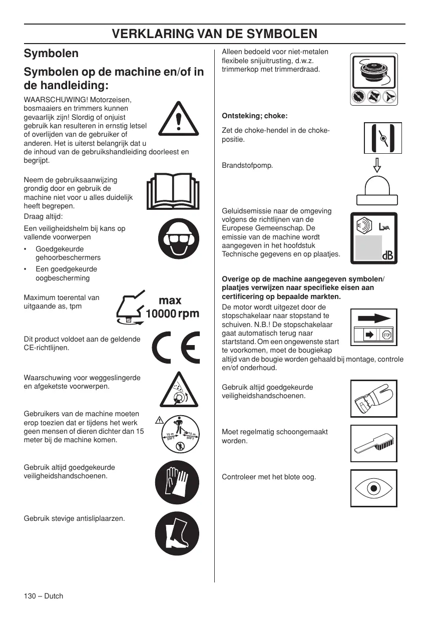 Waarschuwing voor weggeslingerde en afgeketste voorwerpen. Gebruik altijd goedgekeurde veiligheidshandschoenen. Gebruik stevige antisliplaarzen. 130 – Dutch Zet de choke-hendel in de chokepositie. Brandstofpomp. Overige op de machine aangegeven symbolen/ plaatjes verwijzen naar specifieke eisen aan certificering op bepaalde markten. De motor wordt uitgezet door de stopschakelaar naar stopstand te schuiven. N.B.! De stopschakelaar gaat automatisch terug naar startstand. Om een ongewenste start te voorkomen, moet de bougiekap altijd van de bougie worden gehaald bij montage, controle en/of onderhoud. Dit product voldoet aan de geldende CE-richtlijnen. Gebruikers van de machine moeten erop toezien dat er tijdens het werk geen mensen of dieren dichter dan 15 meter bij de machine komen. Ontsteking; choke: Geluidsemissie naar de omgeving volgens de richtlijnen van de Europese Gemeenschap. De emissie van de machine wordt aangegeven in het hoofdstuk Technische gegevens en op plaatjes. Een veiligheidshelm bij kans op vallende voorwerpen