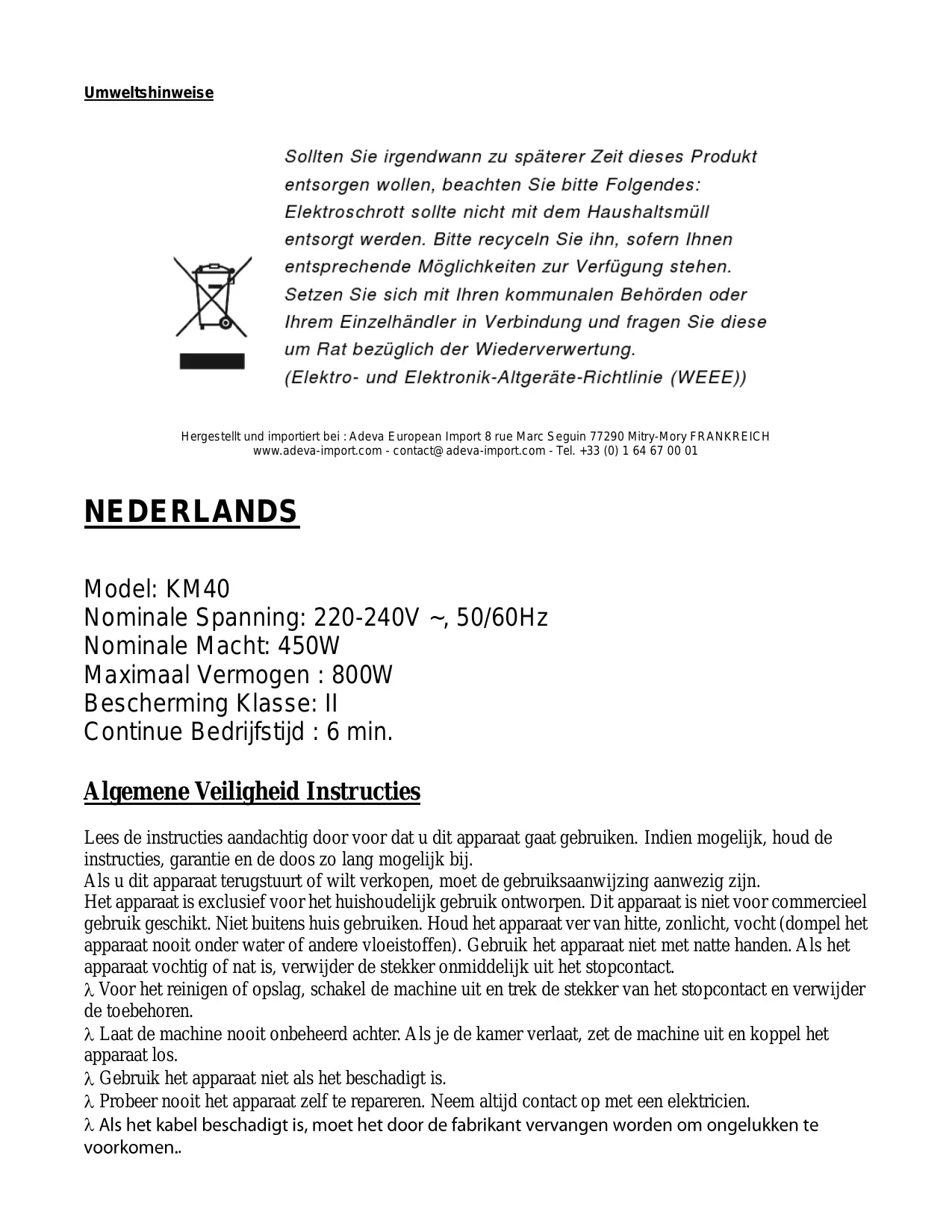Keine Scheuermittel das Reinigen benutzen. Struktur des Produktes Nur ein weiches Tuch oder ein Schwamm um die Hauptstruktur zu reinigen benutzen. Becken und Accesoires ACHTUNG : Das Becken und die Accesoires duerfen nicht in der Spuelmaschine gewaschen werden. Diese koennen mit Wasser und Siefe gewaschen werden. Vergewissern Sie sich das alle Teile vor dem naechsten Gebrauch oder vor dem versorgen trocken sind. Umweltshinweise Hergestellt und importiert bei : Adeva European Import 8 rue Marc Seguin 77290 Mitry-Mory FRANKREICH www.adeva-import.com - contact@adeva-import.com - Tel. +33 (0) 1 64 67 00 01 NEDERLANDS Model: KM40 Nominale Spanning: 220-240V ~, 50/60Hz Nominale Macht: 450W Maximaal Vermogen : 800W Bescherming Klasse: II Continue Bedrijfstijd : 6 min. Algemene Veiligheid Instructies Lees de instructies aandachtig door voor dat u dit apparaat gaat gebruiken. Indien mogelijk, houd de instructies, garantie en de doos zo lang mogelijk bij. Als u dit apparaat terugstuurt of wilt verkopen, moet de gebruiksaanwijzing aanwezig zijn. Het apparaat is exclusief voor het huishoudelijk gebruik ontworpen. Dit apparaat is niet voor commercieel gebruik geschikt. Niet buitens huis gebruiken. Houd het apparaat ver van hitte, zonlicht, vocht (dompel het apparaat nooit onder water of andere vloeistoffen). Gebruik het apparaat niet met natte handen. Als het apparaat vochtig of nat is, verwijder de stekker onmiddelijk uit het stopcontact. Voor het reinigen of opslag, schakel de machine uit en trek de stekker van het stopcontact en verwijder de toebehoren. Laat de machine nooit onbeheerd achter. Als je de kamer verlaat, zet de machine uit en koppel het apparaat los. Gebruik het apparaat niet als het beschadigt is. Probeer nooit het apparaat zelf te repareren. Neem altijd contact op met een elektricien.