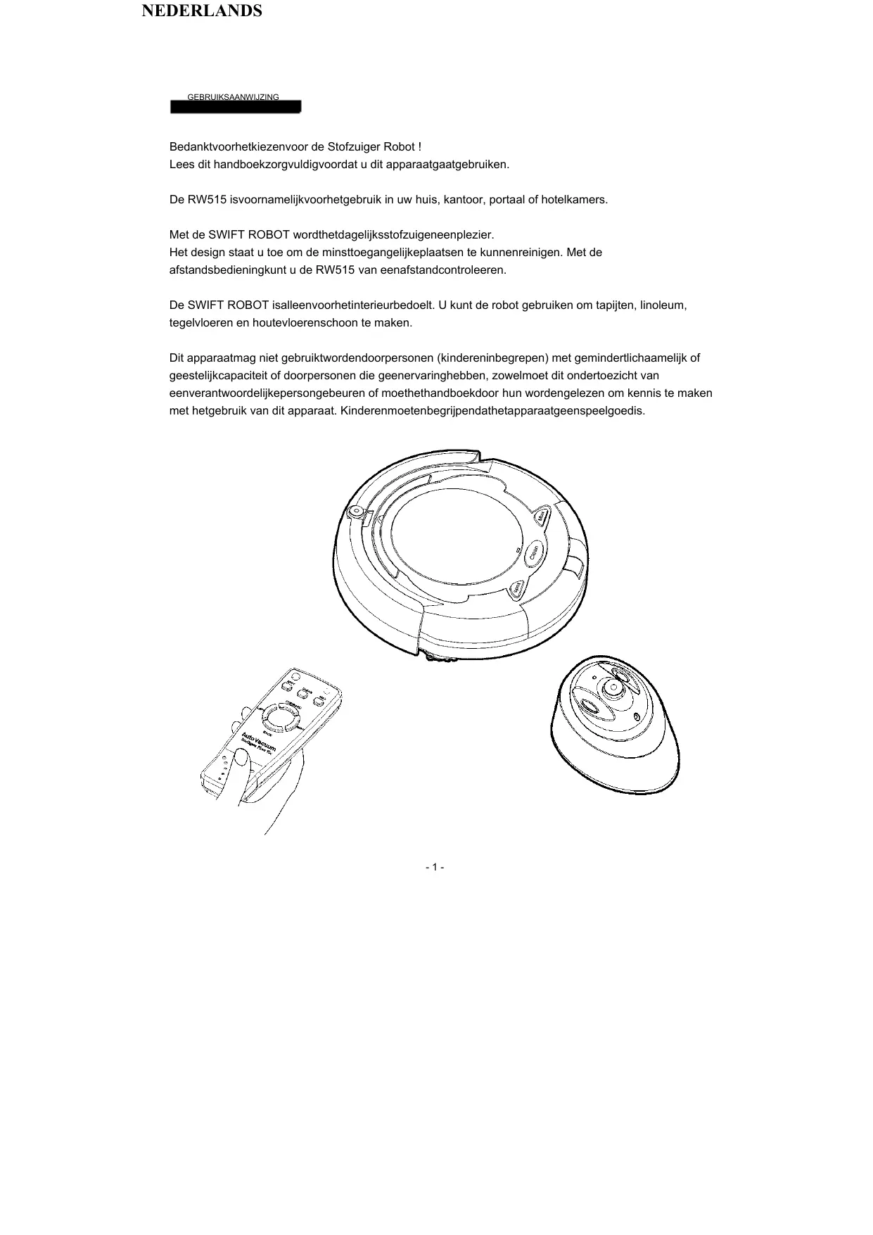 WR515 GEBRUIKSAANWIJZING Attention Zieeroptoedat u onderwerpen die hetapparaatkunnenbelemmeren of beschadigen van de vloerverwijdert. De WR515 wordtgemaakt met eenschoonmaaktoestel die hetmogelijkmaakt om hetstof te visualiseren. Lees de volgendepuntenaandachtig :