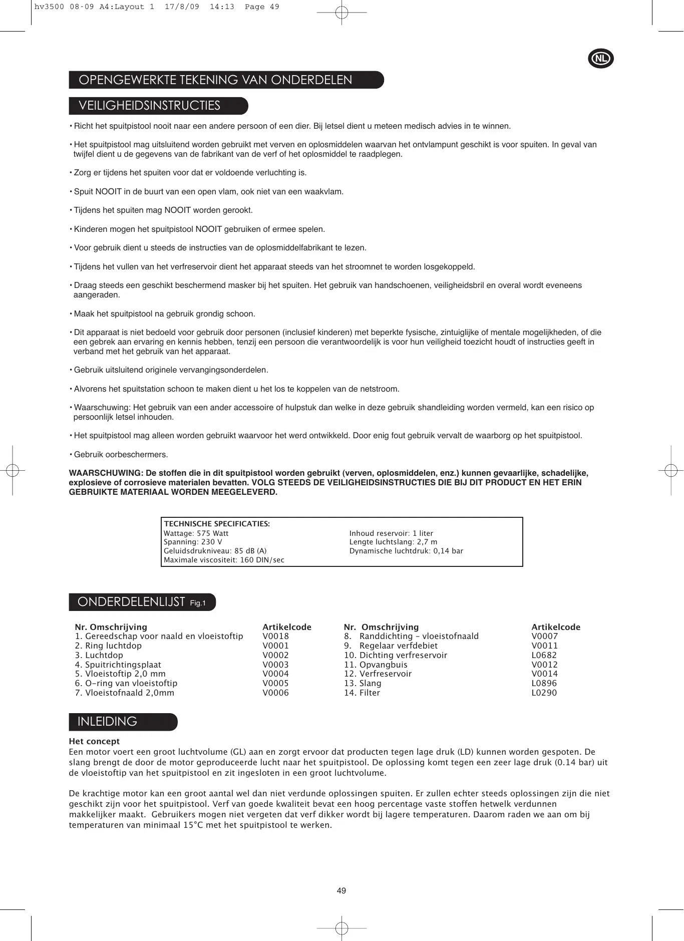 Omschrijving Randdichting – vloeistofnaald Regelaar verfdebiet Dichting verfreservoir Opvangbuis Verfreservoir Slang Filter Artikelcode V0007 V0011 L0682 V0012 V0014 L0896 L0290 INLEIDING Het concept Een motor voert een groot luchtvolume (GL) aan en zorgt ervoor dat producten tegen lage druk (LD) kunnen worden gespoten. De slang brengt de door de motor geproduceerde lucht naar het spuitpistool. De oplossing komt tegen een zeer lage druk (0.14 bar) uit de vloeistoftip van het spuitpistool en zit ingesloten in een groot luchtvolume. De krachtige motor kan een groot aantal wel dan niet verdunde oplossingen spuiten. Er zullen echter steeds oplossingen zijn die niet geschikt zijn voor het spuitpistool. Verf van goede kwaliteit bevat een hoog percentage vaste stoffen hetwelk verdunnen makkelijker maakt. Gebruikers mogen niet vergeten dat verf dikker wordt bij lagere temperaturen. Daarom raden we aan om bij temperaturen van minimaal 15°C met het spuitpistool te werken.