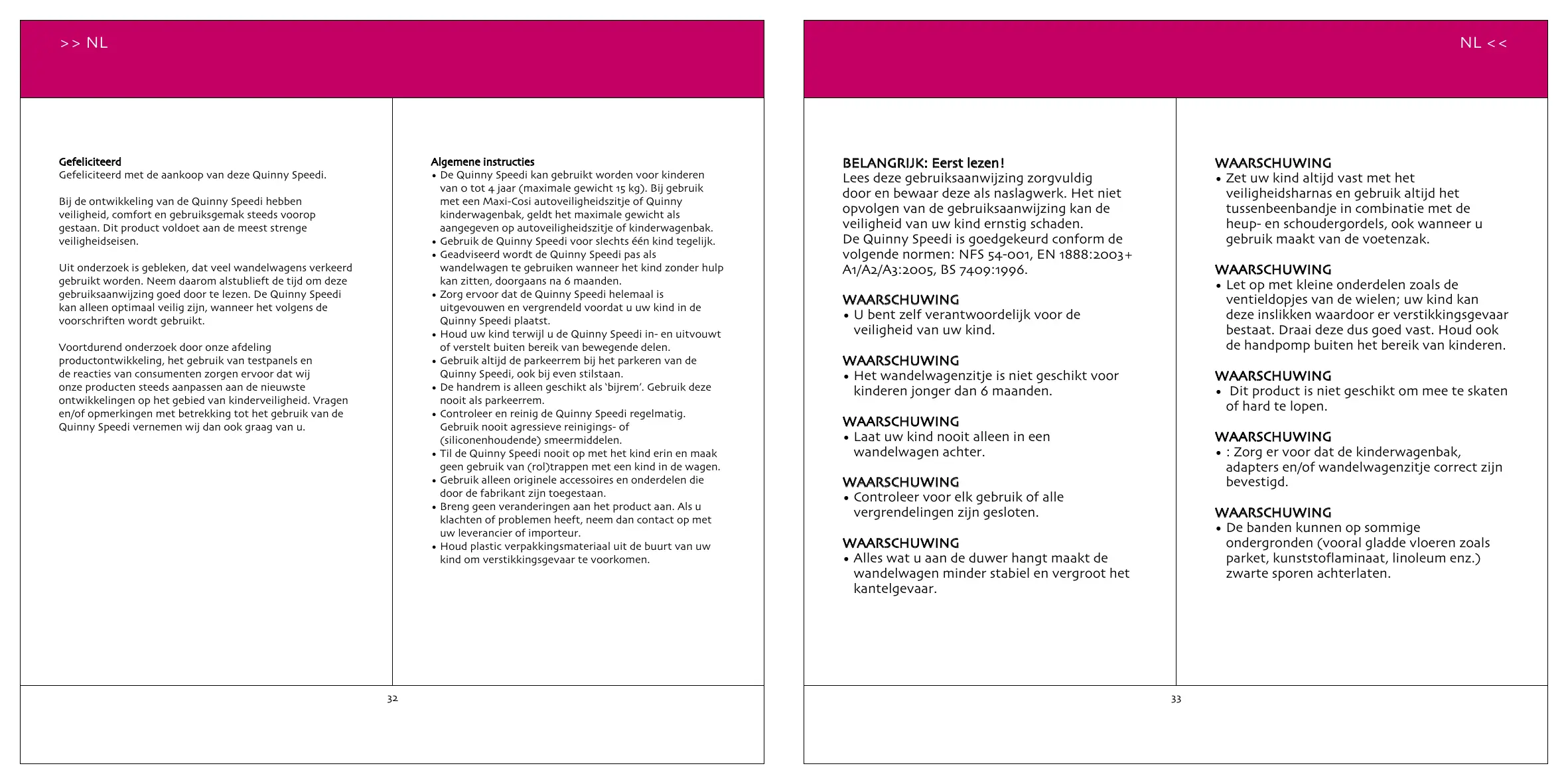 Speedi en combinaison avec un siège-auto Maxi-Cosi ou un couffin Quinny Dreami, le poids maximum indiqué sur ceux-ci est celui qui s’applique. • Ne transportez jamais plus d’un enfant à la fois dans la Quinny Speedi. • Il est recommandé d’utiliser le siège Quinny Speedi comme poussette seulement si votre enfant peut se tenir assis sans aide, en général à partir de 6 mois. • Assurez-vous toujours que la Quinny Speedi est complètement dépliée et que le verrouillage de sécurité est correctement enclenché avant d’y installer votre enfant. • Tenez les enfants éloignés des parties mobiles lorsque vous pliez, dépliez ou réglez la Quinny Speedi. • Utilisez toujours le frein de stationnement lorsque vous arrêtez la Quinny Speedi, même pour un arrêt minute. • Le frein ralentisseur manuel, de type vélo ne doit servir que pour un freinage d’appoint. Il ne doit jamais servir comme frein de stationnement. • Vérifiez et nettoyez régulièrement votre Quinny Speedi. N’utilisez jamais de détergents agressifs ou lubrifiants (à base de silicone). • Lorsque votre enfant se trouve dans la Quinny Speedi, il ne faut jamais la soulever ni emprunter un ascenseur ou un escalier. • Utilisez uniquement des accessoires d’origine et des pièces homologuées par le fabricant. • Aucune modification ne doit être apportée au produit. Pour tout problème ou réclamation, veuillez contacter votre vendeur ou importateur. • Tenez hors de portée des enfants et des animaux tout emballage en plastique pour éviter tout accident.