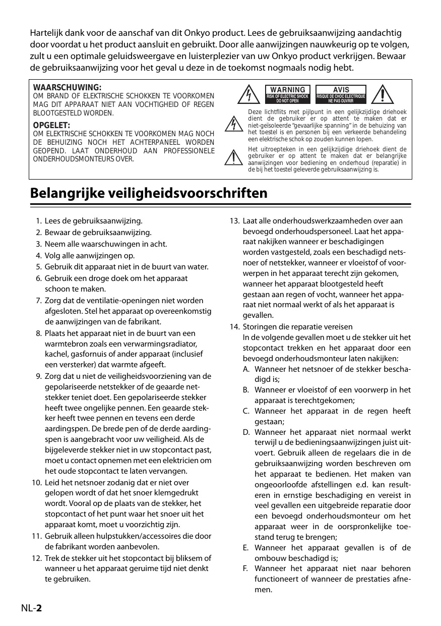 Hartelijk dank voor de aanschaf van dit Onkyo product. Lees de gebruiksaanwijzing aandachtig door voordat u het product aansluit en gebruikt. Door alle aanwijzingen nauwkeurig op te volgen, zult u een optimale geluidsweergave en luisterplezier van uw Onkyo product verkrijgen. Bewaar de gebruiksaanwijzing voor het geval u deze in de toekomst nogmaals nodig hebt. WAARSCHUWING: OM BRAND OF ELEKTRISCHE SCHOKKEN TE VOORKOMEN MAG DIT APPARAAT NIET AAN VOCHTIGHEID OF REGEN BLOOTGESTELD WORDEN.