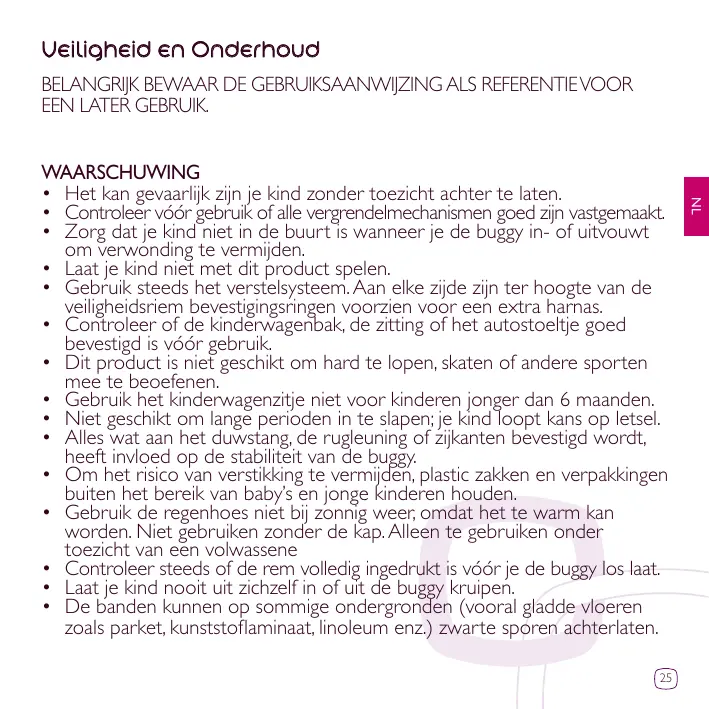 • Pour éviter toute blessure, maintenir votre enfant à l’écart lors du dépliage et du pliage du produit. • Ne pas laisser votre enfant jouer avec ce produit. • Toujours utiliser le système de retenue. Des anneaux pour la fixation d’un harnais supplémentaire sont situés au niveau de la ceinture de maintien, de chaque côté. • Vérifier que les dispositifs de fixation de la nacelle, du siège ou du siège-auto sont correctement enclenchés avant utilisation. • Ne pas utiliser ce produit en faisant du jogging ou des promenades en rollers et toutes autres activités sportives. • Ne pas utiliser ce siège pour des enfants de moins de 6 mois. • Ne convient pas pour de longue période de sommeil, votre enfant risquerait d’être en danger. • Le fait d’accrocher une charge au poussoir, dossier ou côtés influe sur la stabilité du landau/de la poussette. • Pour éviter les risques d’étouffement, conservez les sacs plastique de l’emballage hors de portée des bébés et des jeunes enfants. • Utilisation de l’habillage-pluie: Ne pas utiliser en cas de temps ensoleillé, pour cause de chaleur excessive. Ne pas utiliser l’habillage pluie sans la capote. A utiliser sous la surveillance d’un adulte. • Toujours vérifier que le frein est bien engagé avant de lâcher votre poussette. • Ne jamais laisser votre enfant monter et descendre seul de la poussette. • Les pneus peuvent laisser des traces noires sur certains sols (surtout les sols lisses comme les parquets, les laminés synthétiques, le linoléum, etc.). 19
