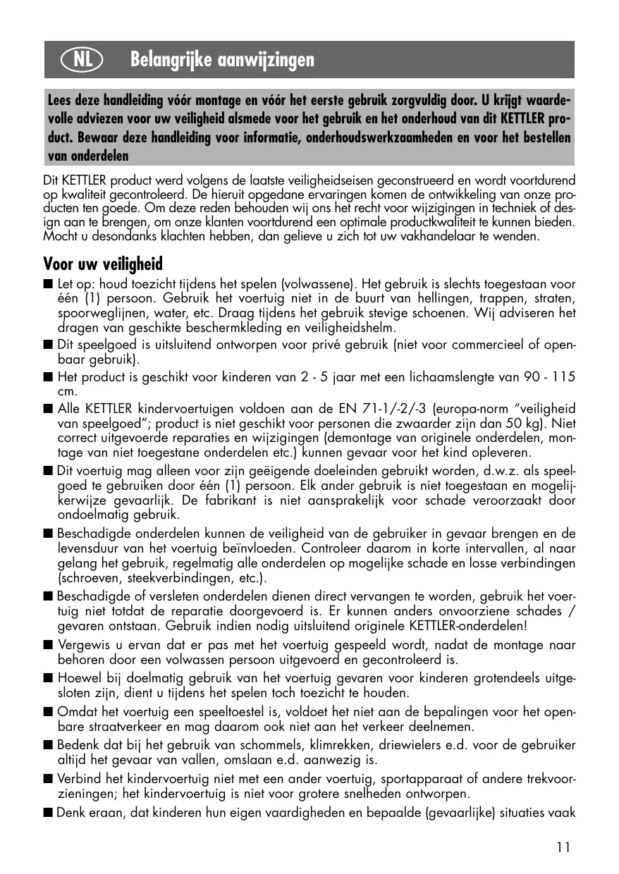 Voor uw veiligheid Let op: houd toezicht tijdens het spelen (volwassene). Het gebruik is slechts toegestaan voor één (1) persoon. Gebruik het voertuig niet in de buurt van hellingen, trappen, straten, spoorweglijnen, water, etc. Draag tijdens het gebruik stevige schoenen. Wij adviseren het dragen van geschikte beschermkleding en veiligheidshelm. Dit speelgoed is uitsluitend ontworpen voor privé gebruik (niet voor commercieel of openbaar gebruik). Het product is geschikt voor kinderen van 2 - 5 jaar met een lichaamslengte van 90 - 115 cm. Alle KETTLER kindervoertuigen voldoen aan de EN 71-1/-2/-3 (europa-norm “veiligheid van speelgoed”; product is niet geschikt voor personen die zwaarder zijn dan 50 kg). Niet correct uitgevoerde reparaties en wijzigingen (demontage van originele onderdelen, montage van niet toegestane onderdelen etc.) kunnen gevaar voor het kind opleveren. Dit voertuig mag alleen voor zijn geëigende doeleinden gebruikt worden, d.w.z. als speelgoed te gebruiken door één (1) persoon. Elk ander gebruik is niet toegestaan en mogelijkerwijze gevaarlijk. De fabrikant is niet aansprakelijk voor schade veroorzaakt door ondoelmatig gebruik. Beschadigde onderdelen kunnen de veiligheid van de gebruiker in gevaar brengen en de levensduur van het voertuig beïnvloeden. Controleer daarom in korte intervallen, al naar gelang het gebruik, regelmatig alle onderdelen op mogelijke schade en losse verbindingen (schroeven, steekverbindingen, etc.). Beschadigde of versleten onderdelen dienen direct vervangen te worden, gebruik het voertuig niet totdat de reparatie doorgevoerd is. Er kunnen anders onvoorziene schades / gevaren ontstaan. Gebruik indien nodig uitsluitend originele KETTLER-onderdelen! Vergewis u ervan dat er pas met het voertuig gespeeld wordt, nadat de montage naar behoren door een volwassen persoon uitgevoerd en gecontroleerd is. Hoewel bij doelmatig gebruik van het voertuig gevaren voor kinderen grotendeels uitgesloten zijn, dient u tijdens het spelen toch toezicht te houden. Omdat het voertuig een speeltoestel is, voldoet het niet aan de bepalingen voor het openbare straatverkeer en mag daarom ook niet aan het verkeer deelnemen. Bedenk dat bij het gebruik van schommels, klimrekken, driewielers e.d. voor de gebruiker altijd het gevaar van vallen, omslaan e.d. aanwezig is. Verbind het kindervoertuig niet met een ander voertuig, sportapparaat of andere trekvoorzieningen; het kindervoertuig is niet voor grotere snelheden ontworpen. Denk eraan, dat kinderen hun eigen vaardigheden en bepaalde (gevaarlijke) situaties vaak 11