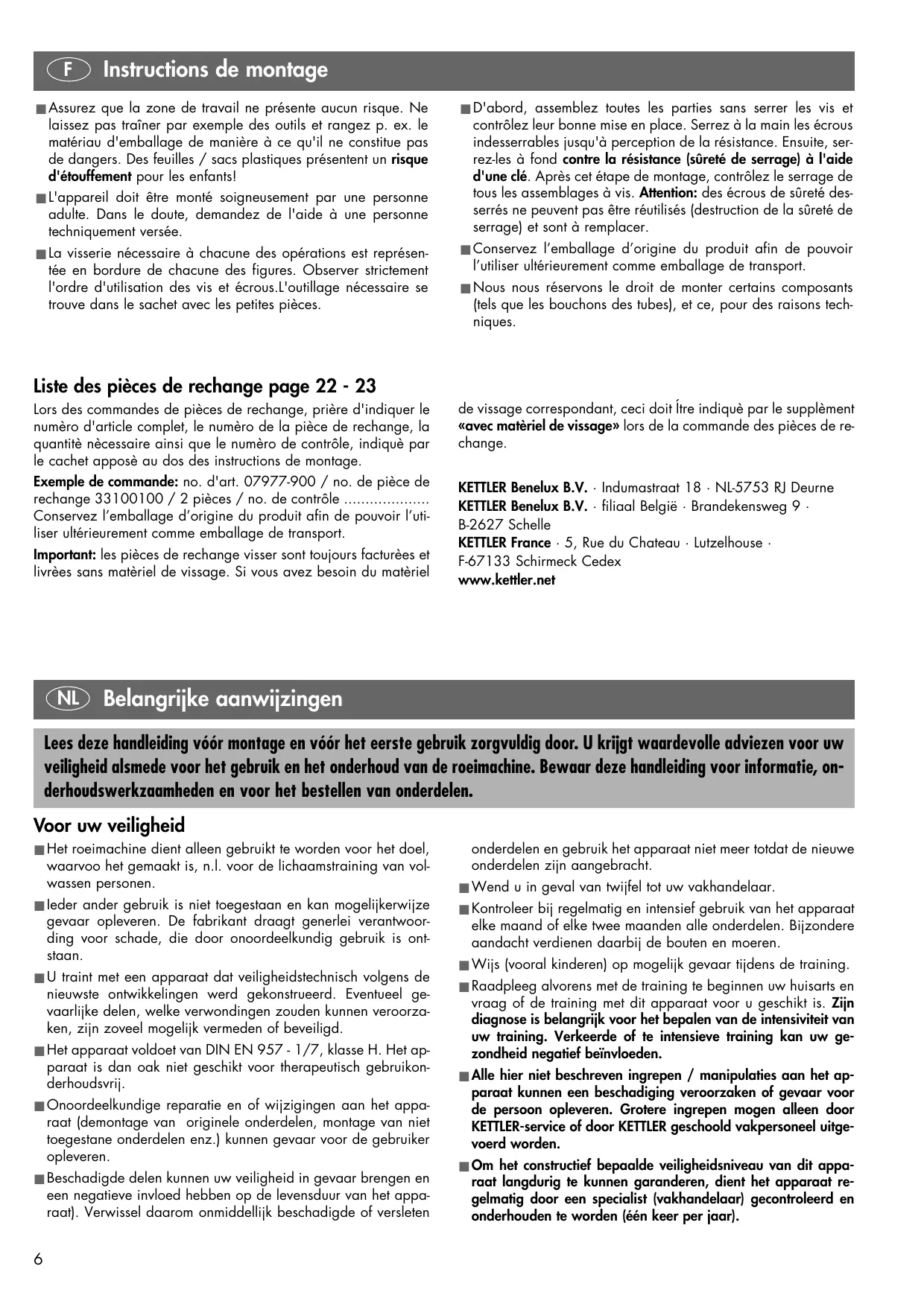 Montagehandleiding Gebruik ■ Overtuig u ervan dat alle belangrijke schroefverbindingen goed vastzitten en niet los kunnen raken. ■ Het apparaat mag niet daar, waar veel mensen langs komen, bijvoorbeeld in de buurt van looppaden, deuren en doorgangen, worden opgesteld. ■ Het it niet aan te raden het apparaat langdurig in een vochtige ruimte te gebruiken in verband met roestvorming. Let u erop, dat er geen vloeistoffen (drank, transpiratie etc.) op onderdelen van het apparaat terechtkomen. Dit kan tot roesten leiden. ■ Het roeimachine dient op een geëgaliseerde, harde onder- grond te worden opgesteld. Leg om de schokken te breken geschikt buffermateriaal (rubber of rieten matten en dergelijke) onder het apparaat. ■ Het roeimachine is bedoeld voor training van volwassenen en is geen speelgoed. Door de natuurlijke speelsheid van kinderen kunnen vaak situaties en gevaren ontstaan, die buiten de verantwoordelijkheid van de fabrikant vallen.Wanneer u desondanks kinderen van het apparaat gebruik wilt laten maken, dient u hen op een juist gebruik te wijzen en ervoor te zorgen dat een volwassene toezicht houdt. ■ Van tijd tot tijd de lagerbusjes van de hydraulische dempers en de roeiarmen van een paar druppels dikke olie voorzien (let op vlekken op de vloerbedekking!). ■ Na langere stilstand van het apparaat kan het voorkomen dat de hydraulische dempers niet meteen het volledige prestatieniveau bereiken. Het is derhalve aanbevelenswaardig om vóór ingebruikname of na langere stilstand de dempers door enige slagen van de roeiarmen te aktiveren. ■ Gebruik voor reiniging van het roeimachine milieuvriendelijke, in geen geval agressieve of bijtende schoonmaakmiddelen. ■ Voor een onberisbpelijke functie van de pulsmeting is een span- ning van ten minste 2, 7 Volt aan het batterijvak vereist. ■ Let erop, dat er nooit vloeistoffen in het binnenste van het ap- paraat of elektronica komen. Dit geldt ook voor transpiratie! ■ Controleer altijd voor elk gebruik van het apparaat of alle schroef- en steekverbindingen nog vast zitten en of de desbetreffende veiligheidsvoorzieningen nog voorhanden zijn. ■ Bij intensieve training kunnen de dempingcylinders erg warm worden. Vermijd lichaamscontact en raak de cylinders na het training niet aan. Montagehandleiding ■ Controleer of alle onderdelen aanwezig zijn (zie checklijst) en ■ Het voor een bepaalde handeling benodigde schroefmateriaal of het toestel tijdens het transport niet beschadigd is. Voor reclamaties gelieve u zich tot uw vakhandelaar te wenden. wordt in het bijbehorende kader afgebeeld. Gebruik het schroefmateriaal precies zoals aangegeven op de afbeeldingen. Het benodigde gereedschap vindt u in het bijgeleverde gereedschapzakje. ■ Denk eraan, dat bij elk gebruik van gereedschap en bij han- denarbeid er altijd kans op blessure is. Werk daarom zorgvuldig en voorzichtig bij het monteren van het apparaat! ■ Let erop dat bij elk gebruik van gereedschap en bij handenar- beid er altijd kans op blessure is. Werk daarom zorgvuldig en voorzichtig bij het monteren van het apparaat! ■ Zorg voor een gevarenvrije werkomgeving, laat bijvoorbeeld geen gereedschap slingeren. Deponeer bijv. verpakkingsmateriaal zo, dat geen gevaren daaruit voort kunnen komen. Bij folies/plastic zakken bestaat voor kinderen verstikkingsgevaar! ■ Het apparaat dient door een volwassene gemonteerd te wor- den. In geval van twijfel de hulp van een extra, technisch aangelegde persoon inroepen. ■ Schroef eerst alle onderdelen losjes vast en controleer of ze op de juist plek zitten. Draai de borgmoeren met de hand vast tot u weerstand voelt, vervolgens schroeft u ze met een sleutel tegen de weerstand in (klemborg) goed vast. Controleer na elke montagestap of de schroefverbindingen goed vast zitten. Pas op: borgmoeren die weer los zijn gegaan zijn onbruikbaar (de klemborg is vernield) en moet door een nieuwe vervangen worden. ■ Bewaar de originele verpakking, zodat u deze later indien no- dig als transportverpakking kunt gebruiken. ■ Om productietechnische redenen behouden wij ons het recht voor sommige delen (bij-voorbeeld buisstoppen) vóór te monteren. Onderdelenlijst bladzijde 22-23 Geef bij bestelling van onderdelen s.v.p. het volledige artikelnr., onderdeelnummer, het benodigde aantal evenals het controlenummer aan. Bestelvoorbeeld: artikelnr. 07977-900 / onderdeelnr. 33100100/ 2 stuks/controlenr. .................... Bewaar de originele verpakking, zodat u deze later indien nodig als transportverpakking kunt gebruiken. Belangrijk: Vast te schroeven onderdelen worden in principe zonder schroefmateriaal berekend en geleverd. Indien er behoefte aan dit schroefmateriaal bestaat, dan kan dit door de toevoeging „met schroefmateriaal“ bij de onderdeelbestelling worden vermeld. KETTLER Benelux B.V. · Indumastraat 18 · NL-5753 RJ Deurne KETTLER Benelux B.V. · filiaal België · Brandekensweg 9 · B-2627 Schelle www.kettler.net