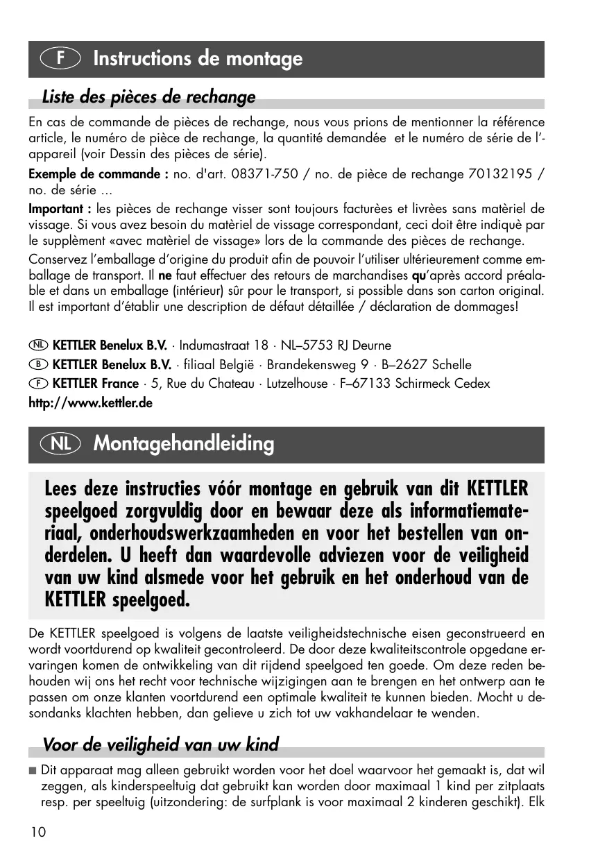 En cas de commande de pièces de rechange, nous vous prions de mentionner la référence article, le numéro de pièce de rechange, la quantité demandée et le numéro de série de l’appareil (voir Dessin des pièces de série). Exemple de commande : no. d'art. 08371-750 / no. de pièce de rechange 70132195 / no. de série ... Important : les pièces de rechange visser sont toujours facturèes et livrèes sans matèriel de vissage. Si vous avez besoin du matèriel de vissage correspondant, ceci doit être indiquè par le supplèment «avec matèriel de vissage» lors de la commande des pièces de rechange. Conservez l’emballage d’origine du produit afin de pouvoir l’utiliser ultérieurement comme emballage de transport. Il ne faut effectuer des retours de marchandises qu’après accord préalable et dans un emballage (intérieur) sûr pour le transport, si possible dans son carton original. Il est important d’établir une description de défaut détaillée / déclaration de dommages! KETTLER Benelux B.V. · Indumastraat 18 · NL–5753 RJ Deurne KETTLER Benelux B.V. · filiaal België · Brandekensweg 9 · B–2627 Schelle F KETTLER France · 5, Rue du Chateau · Lutzelhouse · F–67133 Schirmeck Cedex http://www.kettler.de
