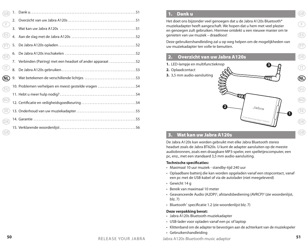 GR De Jabra A120s kan worden gebruikt met elke Jabra Bluetooth stereo headset zoals de Jabra BT620s. U kunt de adapter aansluiten op de meeste audiobronnen, zoals een draagbare MP3-speler, een spelletjescomputer, een pc, enz., met een standaard 3,5 mm audio-aansluiting. Technische specificaties: • Maximaal 10 uur muziek - standby-tijd 240 uur • Oplaadbare batterij die kan worden opgeladen vanaf een stopcontact, vanaf een pc met de USB-kabel of via de autolader (niet meegeleverd) • Gewicht 14 g • Bereik van maximaal 10 meter • Geavanceerde Audio (A2DP)5, afstandsbediening (AVRCP)6 (zie woordenlijst, blz. 7) • Bluetooth1 specificatie 1.2 (zie woordenlijst blz. 7)