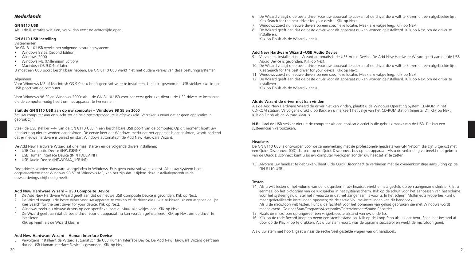 GN 8110 USB instelling Systeemeisen De GN 8110 USB vereist het volgende besturingssysteem: • Windows 98 SE (Second Edition) • Windows 2000 • Windows ME (Millennium Edition) • Macintosh OS 9.0.4 of later U moet een USB poort beschikbaar hebben. De GN 8110 USB werkt niet met oudere versies van deze besturingssystemen. Algemeen Voor Windows ME of Macintosh OS 9.0.4: u hoeft geen software te installeren. U steekt gewoon de USB stekker u in een USB poort van de computer. Voor Windows 98 SE en Windows 2000: als u de GN 8110 USB voor het eerst gebruikt, dient u de USB drivers te installeren die de computer nodig heeft om het apparaat te herkennen. Sluit de GN 8110 USB aan op uw computer – Windows 98 SE en 2000 Zet uw computer aan en wacht tot de hele opstartprocedure is afgewikkeld. Verzeker u ervan dat er geen applicaties in gebruik zijn. Steek de USB stekker u van de GN 8110 USB in een beschikbare USB poort van de computer. Op dit moment hoeft uw headset nog niet te worden aangesloten. De eerste keer dat Windows merkt dat het apparaat is aangesloten, wordt herkend dat er nieuwe hardware is vereist en start Windows automatisch de Add New Hardware Wizard. De • • •