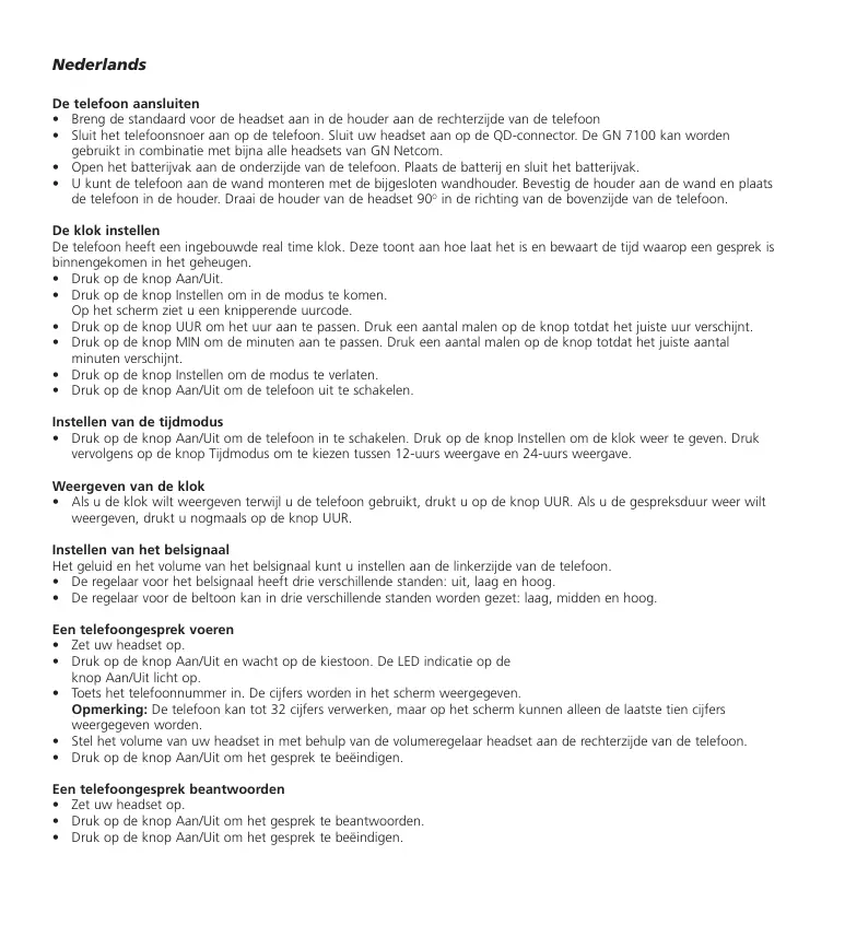 Nederlands De telefoon aansluiten • Breng de standaard voor de headset aan in de houder aan de rechterzijde van de telefoon • Sluit het telefoonsnoer aan op de telefoon. Sluit uw headset aan op de QD-connector. De GN 7100 kan worden gebruikt in combinatie met bijna alle headsets van GN Netcom. • Open het batterijvak aan de onderzijde van de telefoon. Plaats de batterij en sluit het batterijvak. • U kunt de telefoon aan de wand monteren met de bijgesloten wandhouder. Bevestig de houder aan de wand en plaats de telefoon in de houder. Draai de houder van de headset 90O in de richting van de bovenzijde van de telefoon. De klok instellen De telefoon heeft een ingebouwde real time klok. Deze toont aan hoe laat het is en bewaart de tijd waarop een gesprek is binnengekomen in het geheugen. • Druk op de knop Aan/Uit. • Druk op de knop Instellen om in de modus te komen. Op het scherm ziet u een knipperende uurcode. • Druk op de knop UUR om het uur aan te passen. Druk een aantal malen op de knop totdat het juiste uur verschijnt. • Druk op de knop MIN om de minuten aan te passen. Druk een aantal malen op de knop totdat het juiste aantal minuten verschijnt. • Druk op de knop Instellen om de modus te verlaten. • Druk op de knop Aan/Uit om de telefoon uit te schakelen. Instellen van de tijdmodus • Druk op de knop Aan/Uit om de telefoon in te schakelen. Druk op de knop Instellen om de klok weer te geven. Druk vervolgens op de knop Tijdmodus om te kiezen tussen 12-uurs weergave en 24-uurs weergave. Weergeven van de klok • Als u de klok wilt weergeven terwijl u de telefoon gebruikt, drukt u op de knop UUR. Als u de gespreksduur weer wilt weergeven, drukt u nogmaals op de knop UUR. Instellen van het belsignaal Het geluid en het volume van het belsignaal kunt u instellen aan de linkerzijde van de telefoon. • De regelaar voor het belsignaal heeft drie verschillende standen: uit, laag en hoog. • De regelaar voor de beltoon kan in drie verschillende standen worden gezet: laag, midden en hoog. Een telefoongesprek voeren • Zet uw headset op. • Druk op de knop Aan/Uit en wacht op de kiestoon. De LED indicatie op de knop Aan/Uit licht op. • Toets het telefoonnummer in. De cijfers worden in het scherm weergegeven. Opmerking: De telefoon kan tot 32 cijfers verwerken, maar op het scherm kunnen alleen de laatste tien cijfers weergegeven worden. • Stel het volume van uw headset in met behulp van de volumeregelaar headset aan de rechterzijde van de telefoon. • Druk op de knop Aan/Uit om het gesprek te beëindigen. Een telefoongesprek beantwoorden • Zet uw headset op. • Druk op de knop Aan/Uit om het gesprek te beantwoorden. • Druk op de knop Aan/Uit om het gesprek te beëindigen.