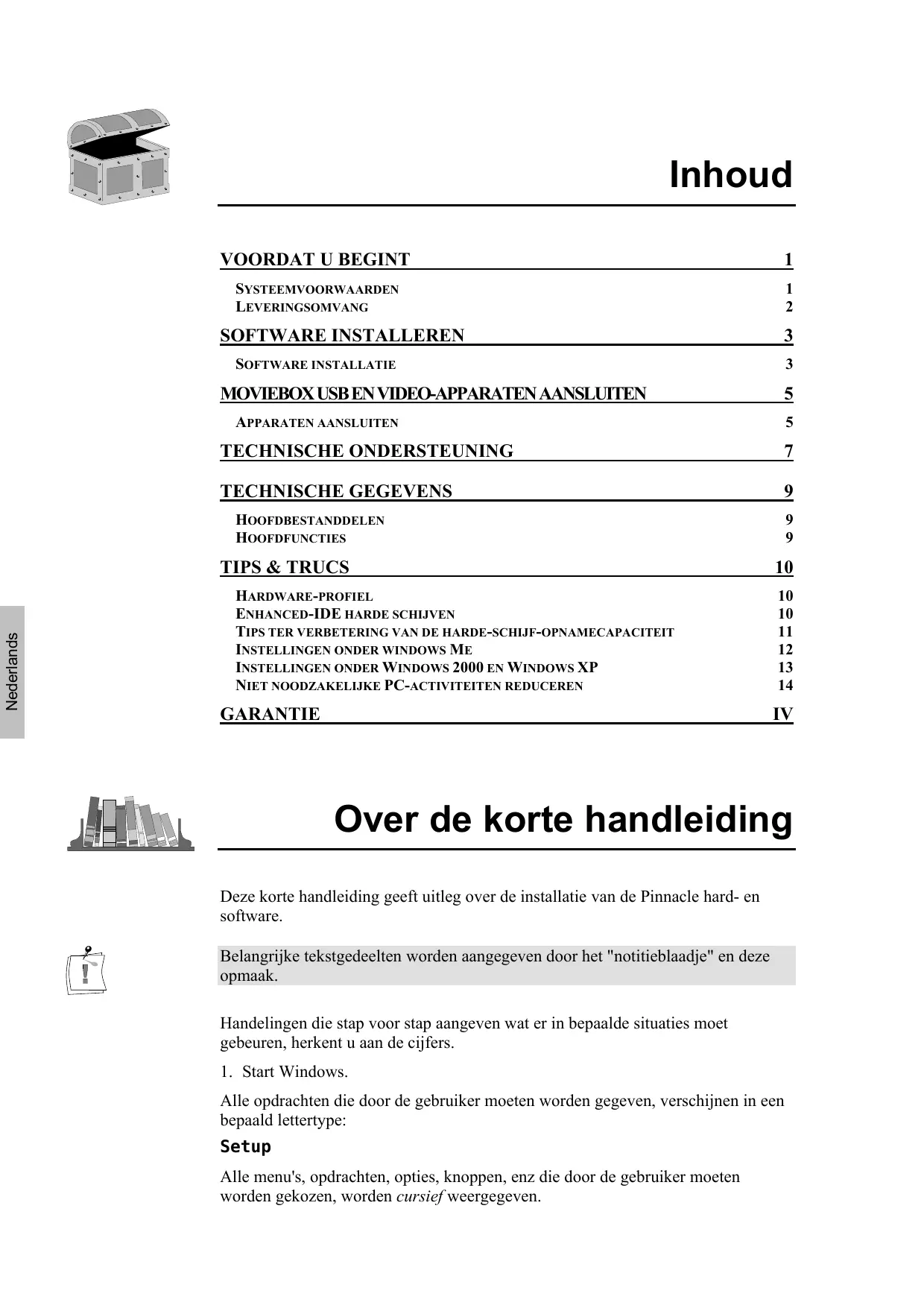 Over de korte handleiding Deze korte handleiding geeft uitleg over de installatie van de Pinnacle hard- en software. Belangrijke tekstgedeelten worden aangegeven door het "notitieblaadje" en deze opmaak. Handelingen die stap voor stap aangeven wat er in bepaalde situaties moet gebeuren, herkent u aan de cijfers.