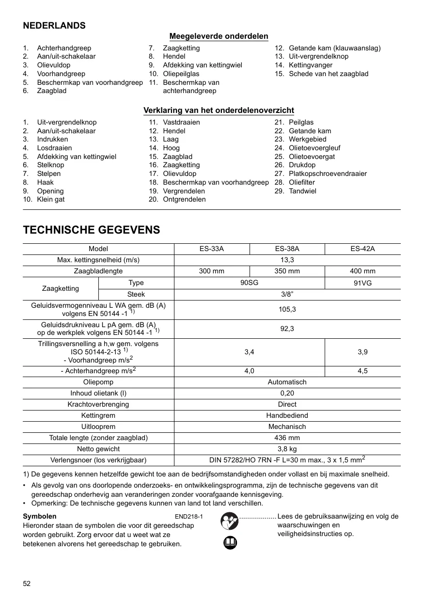 ................... Let op: bijzondere voorzichtigheid en aandacht vereist! ................... Let op: trek de stekker onmiddellijk uit het stopcontact als het netsnoer beschadigd is! ................... Let op: terugslag! ................... Bescherm tegen regen en vocht! ................... Draag een veiligheidshelm, veiligheidsbril en oorbescherming! ................... Draag veiligheidshandschoenen! ................... Trek de stekker uit het stopcontact! ................... EHBO RE Y ......... Recyclen ................... CE-symbool ........... Maximaal toelaatbare lengte van zaagsnede .......... Draairichting van de ketting ................... Kettingolie ............. Kettingrem los/vast gezet ................... Verboden! Gebruiksdoeleinden Het gereedschap is bedoeld om stammen te zagen. Voeding Het gereedschap mag uitsluitend worden aangesloten op een voeding met dezelfde spanning als aangegeven op het identificatieplaatje en werkt alleen op enkele-fase wisselstroom. Het gereedschap is dubbel geïsoleerd volgens de Europese norm en mag derhalve ook op een niet-geaard stopcontact worden aangesloten. Voor het openbare laagspanningsnet van 220 V t/m 250 V. Het in- en uitschakelen van elektrische apparatuur veroorzaakt spanningsfluctuaties. Het gebruik van dit gereedschap terwijl het elektriciteitsnet in een slechte toestand verkeert, kan de werking van andere apparatuur nadelig beïnvloeden. Als de netweerstand lager is dan 0,35 ohm, mag u ervan uitgaan dat geen nadelige effecten optreden. Het stopcontact waarop dit gereedschap is aangesloten moet zijn beveiligd met een zekering of veiligheidsstroomonderbreker met trage uitschakeling. AANVULLENDE VEILIGHEIDSVOORSCHRIFTEN ENB098-1