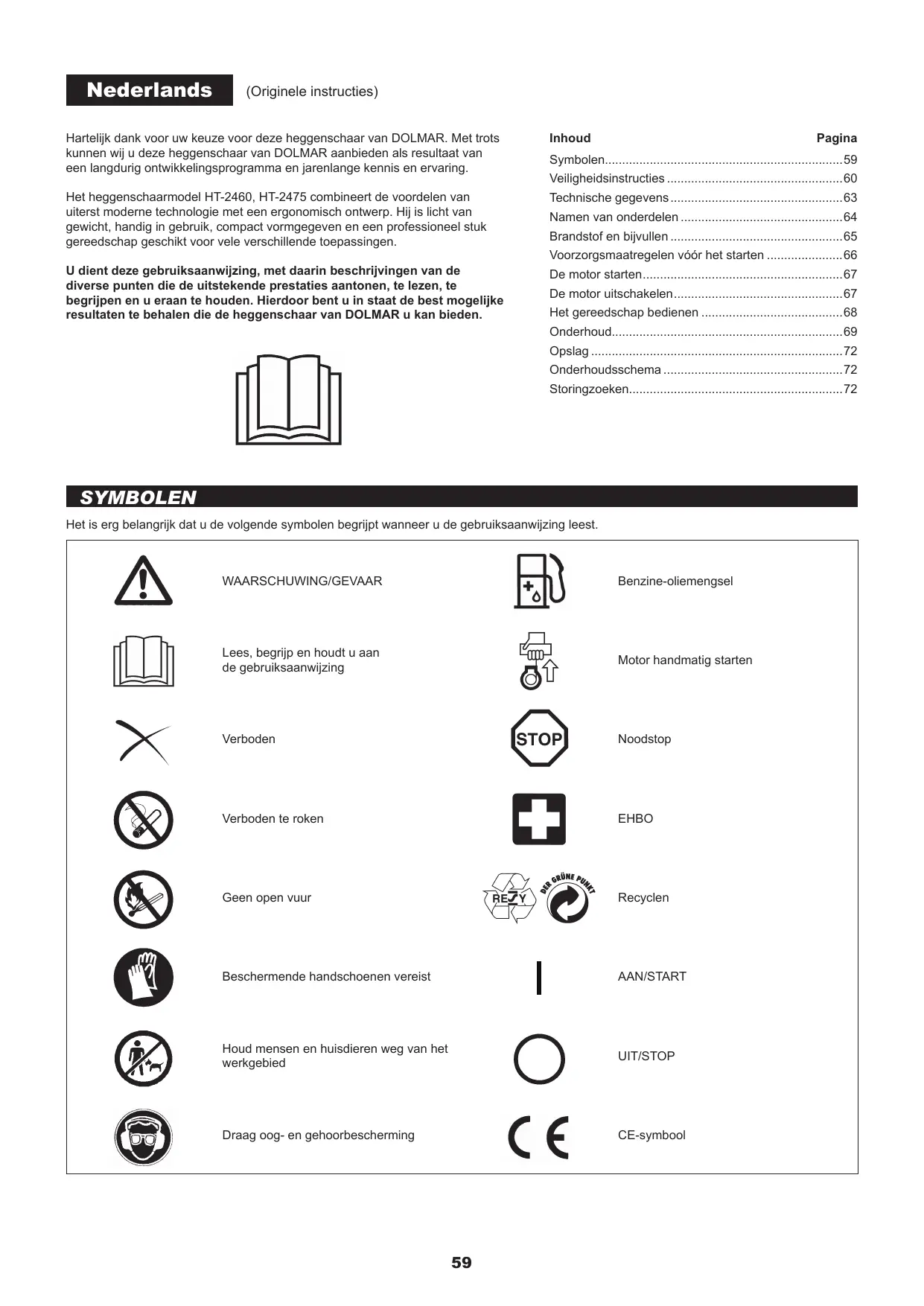 Download de handleiding voor uw Heggenschaar in PDF-formaat gratis! Vind uw handleiding HT-2460 - DOLMAR en neem uw elektronisch apparaat weer in handen. Op deze pagina staan alle documenten die nodig zijn voor het gebruik van uw apparaat. HT-2460 van het merk DOLMAR.
