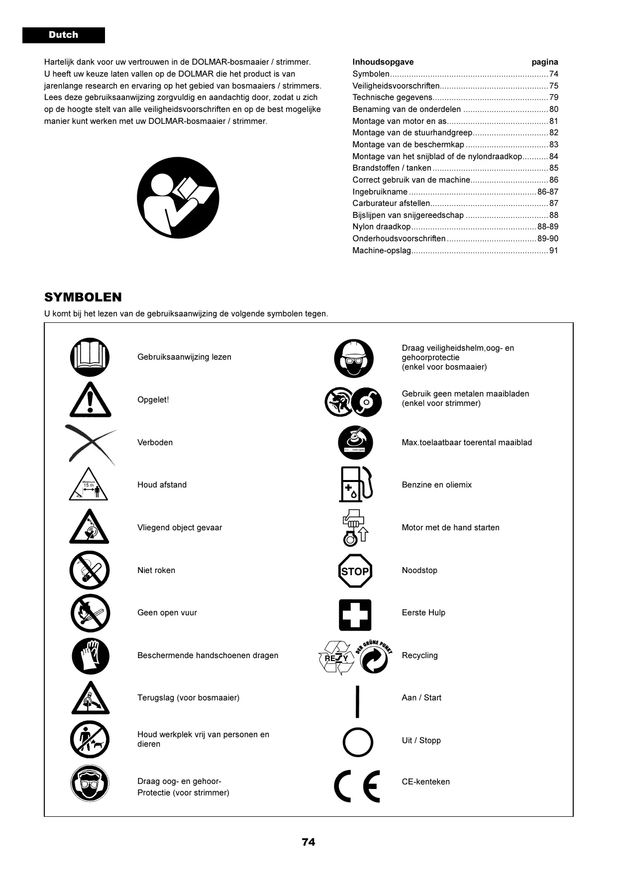 - MS-22U MS-22C Important: Read this instruction manual carefully before putting the Grass Trimmer into operation and strictly observe the safety regulations! Preserve instruction manual carefully! Recommandation importante: Lire soigneusement ce manuel d’instructions avant de mettre la débroussailleuse en service et observer rigoureusement les consignes de sécurité! Conserver soigneusement ce manuel d’instructions. Wichtlg: Bitte lesen Sie dieses Anweisungshandbuch sorgfältig durch, bevor Sie den Motorsense in Betrieb nehmen, und beachten Sie die Sicherheitsvorschriften strikt! Bewahren Sie das Anweisungshandbuch sorgfältig auf. Importante: Prima di mettere in funzione il Strimmer, leggere attentamente il presente manuale; rispettare rigorosamente le norme di sicurezza! Conservare il manuale delle istruzioni per l’uso! Belangrijk: Lees voor het in gebruik nemen van de bosmaaier deze gebruiksaarwijzing zorgvuldig door en neem alle veiligheidsvoorschriften in acht. Bewaar de gebruiksaanwijzing voor eventuele naslag. Importante: Leer cuidadosamente este manual de instrucciones antes de poner en marcha la máquina y observar estrictamente las normas de seguridad. Conservar este manual de instrucciones con cuidado. Dutch Hartelijk dank voor uw vertrouwen in de DOLMAR-bosmaaier / strimmer. U heeft uw keuze laten vallen op de DOLMAR die het product is van jarenlange research en ervaring op het gebied van bosmaaiers / strimmers. Lees deze gebruiksaanwijzing zorgvuldig en aandachtig door, zodat u zich op de hoogte stelt van alle veiligheidsvoorschriften en op de best mogelijke manier kunt werken met uw DOLMAR-bosmaaier / strimmer. Inhoudsopgave pagina Symbolen p. 74
