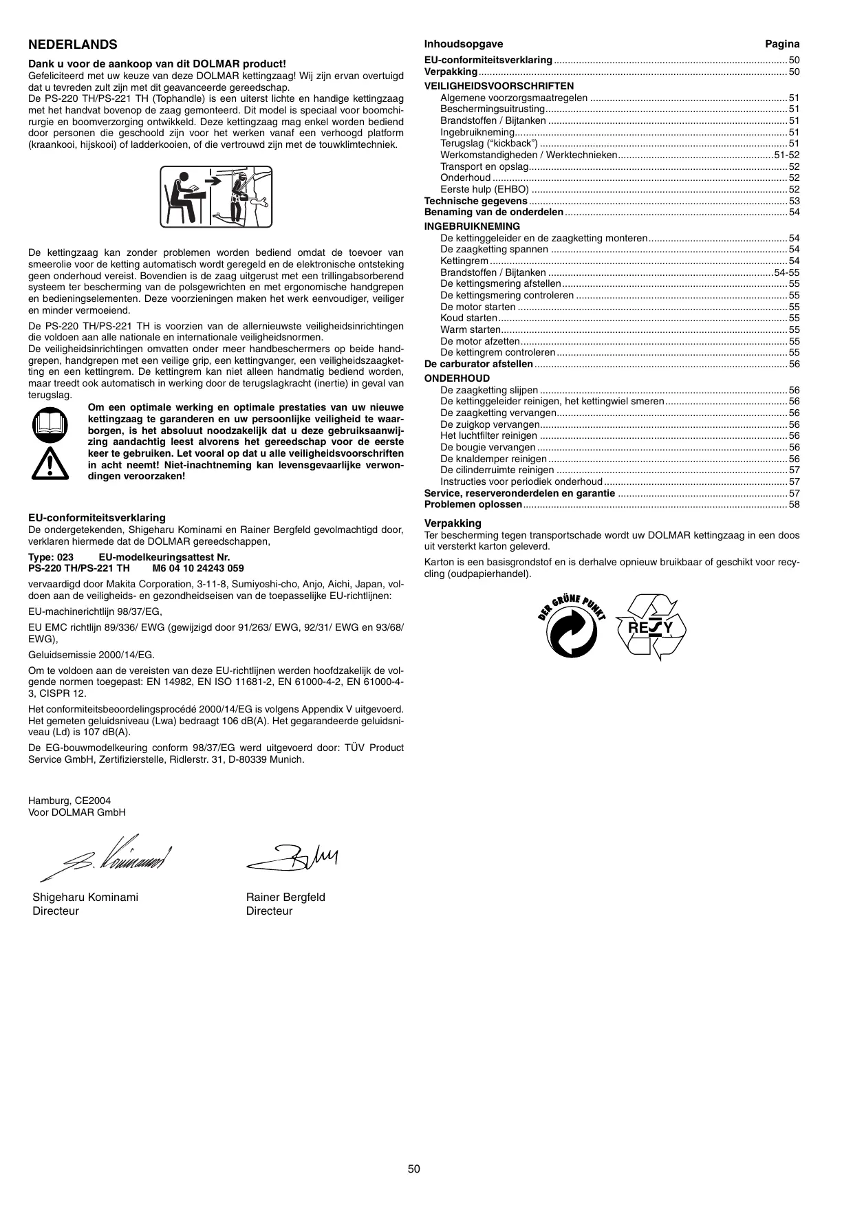 - Problemen oplossen Gefeliciteerd met uw keuze van deze DOLMAR kettingzaag! Wij zijn ervan overtuigd dat u tevreden zult zijn met dit geavanceerde gereedschap. De PS-220 TH/PS-221 TH (Tophandle) is een uiterst lichte en handige kettingzaag met het handvat bovenop de zaag gemonteerd. Dit model is speciaal voor boomchirurgie en boomverzorging ontwikkeld. Deze kettingzaag mag enkel worden bediend door personen die geschoold zijn voor het werken vanaf een verhoogd platform (kraankooi, hijskooi) of ladderkooien, of die vertrouwd zijn met de touwklimtechniek. De kettingzaag kan zonder problemen worden bediend omdat de toevoer van smeerolie voor de ketting automatisch wordt geregeld en de elektronische ontsteking geen onderhoud vereist. Bovendien is de zaag uitgerust met een trillingabsorberend systeem ter bescherming van de polsgewrichten en met ergonomische handgrepen en bedieningselementen. Deze voorzieningen maken het werk eenvoudiger, veiliger en minder vermoeiend. De PS-220 TH/PS-221 TH is voorzien van de allernieuwste veiligheidsinrichtingen die voldoen aan alle nationale en internationale veiligheidsnormen. De veiligheidsinrichtingen omvatten onder meer handbeschermers op beide handgrepen, handgrepen met een veilige grip, een kettingvanger, een veiligheidszaagketting en een kettingrem. De kettingrem kan niet alleen handmatig bediend worden, maar treedt ook automatisch in werking door de terugslagkracht (inertie) in geval van terugslag. Om een optimale werking en optimale prestaties van uw nieuwe kettingzaag te garanderen en uw persoonlijke veiligheid te waarborgen, is het absoluut noodzakelijk dat u deze gebruiksaanwijzing aandachtig leest alvorens het gereedschap voor de eerste keer te gebruiken. Let vooral op dat u alle veiligheidsvoorschriften in acht neemt! Niet-inachtneming kan levensgevaarlijke verwondingen veroorzaken! EU-conformiteitsverklaring Pagina Verpakking De ondergetekenden, Shigeharu Kominami en Rainer Bergfeld gevolmachtigd door, verklaren hiermede dat de DOLMAR gereedschappen, Ter bescherming tegen transportschade wordt uw DOLMAR kettingzaag in een doos uit versterkt karton geleverd. Type: 023 EU-modelkeuringsattest Nr. PS-220 TH/PS-221 TH M6 04 10 24243 059 Karton is een basisgrondstof en is derhalve opnieuw bruikbaar of geschikt voor recycling (oudpapierhandel). vervaardigd door Makita Corporation, 3-11-8, Sumiyoshi-cho, Anjo, Aichi, Japan, voldoen aan de veiligheids- en gezondheidseisen van de toepasselijke EU-richtlijnen: EU-machinerichtlijn 98/37/EG, RE Y EU EMC richtlijn 89/336/ EWG (gewijzigd door 91/263/ EWG, 92/31/ EWG en 93/68/ EWG), Geluidsemissie 2000/14/EG. Om te voldoen aan de vereisten van deze EU-richtlijnen werden hoofdzakelijk de volgende normen toegepast: EN 14982, EN ISO 11681-2, EN 61000-4-2, EN 61000-43, CISPR 12. Het conformiteitsbeoordelingsprocédé 2000/14/EG is volgens Appendix V uitgevoerd. Het gemeten geluidsniveau (Lwa) bedraagt 106 dB(A). Het gegarandeerde geluidsniveau (Ld) is 107 dB(A). De EG-bouwmodelkeuring conform 98/37/EG werd uitgevoerd door: TÜV Product Service GmbH, Zertifizierstelle, Ridlerstr. 31, D-80339 Munich. Hamburg, CE2004 Voor DOLMAR GmbH Shigeharu Kominami Directeur Rainer Bergfeld Directeur p. 58