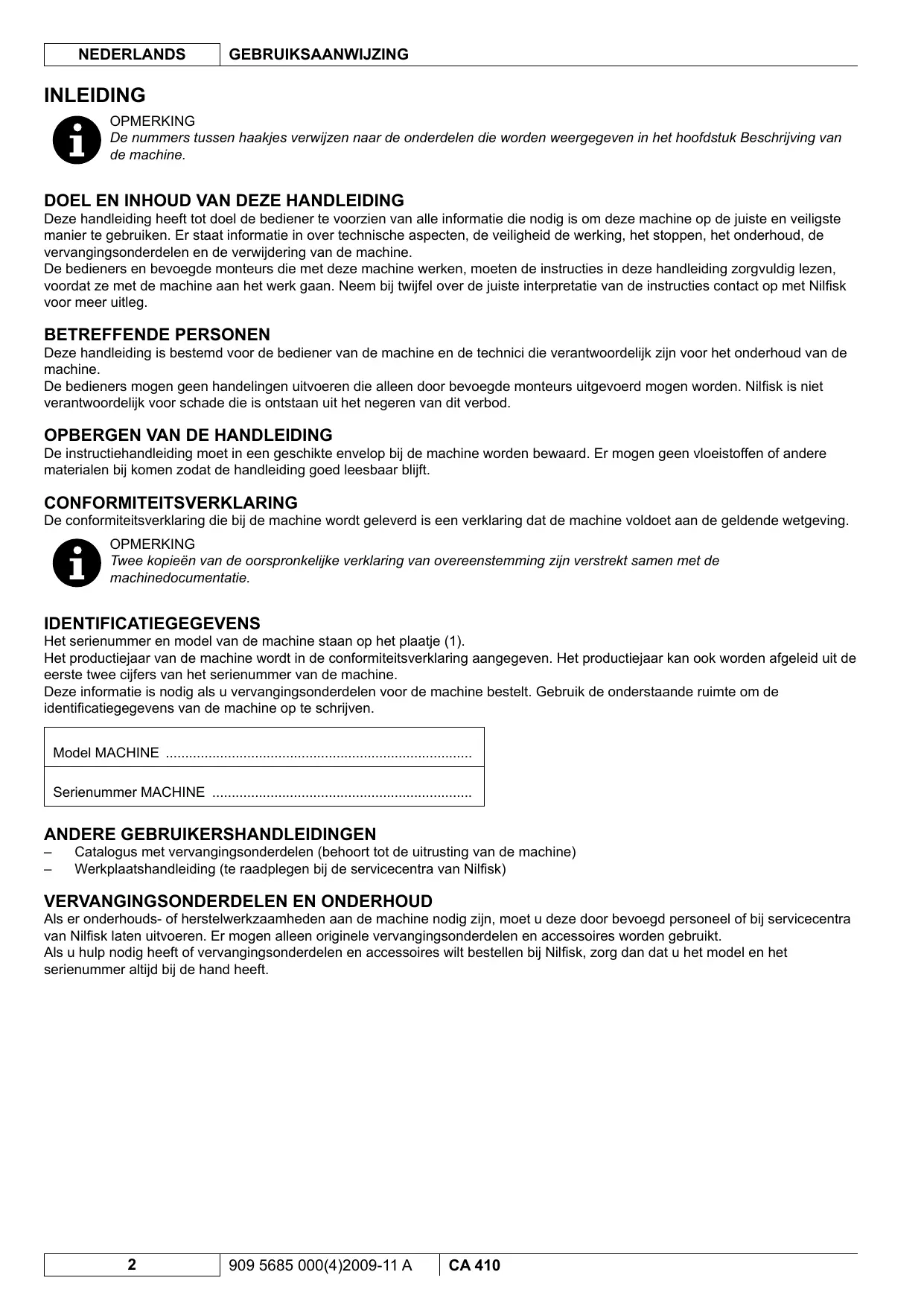 Als er onderhouds- of herstelwerkzaamheden aan de machine nodig zijn, moet u deze door bevoegd personeel of bij servicecentra van Nilfisk laten uitvoeren. Er mogen alleen originele vervangingsonderdelen en accessoires worden gebruikt. Als u hulp nodig heeft of vervangingsonderdelen en accessoires wilt bestellen bij Nilfisk, zorg dan dat u het model en het serienummer altijd bij de hand heeft. 2 909 5685 000(4)2009-11 A CA 410