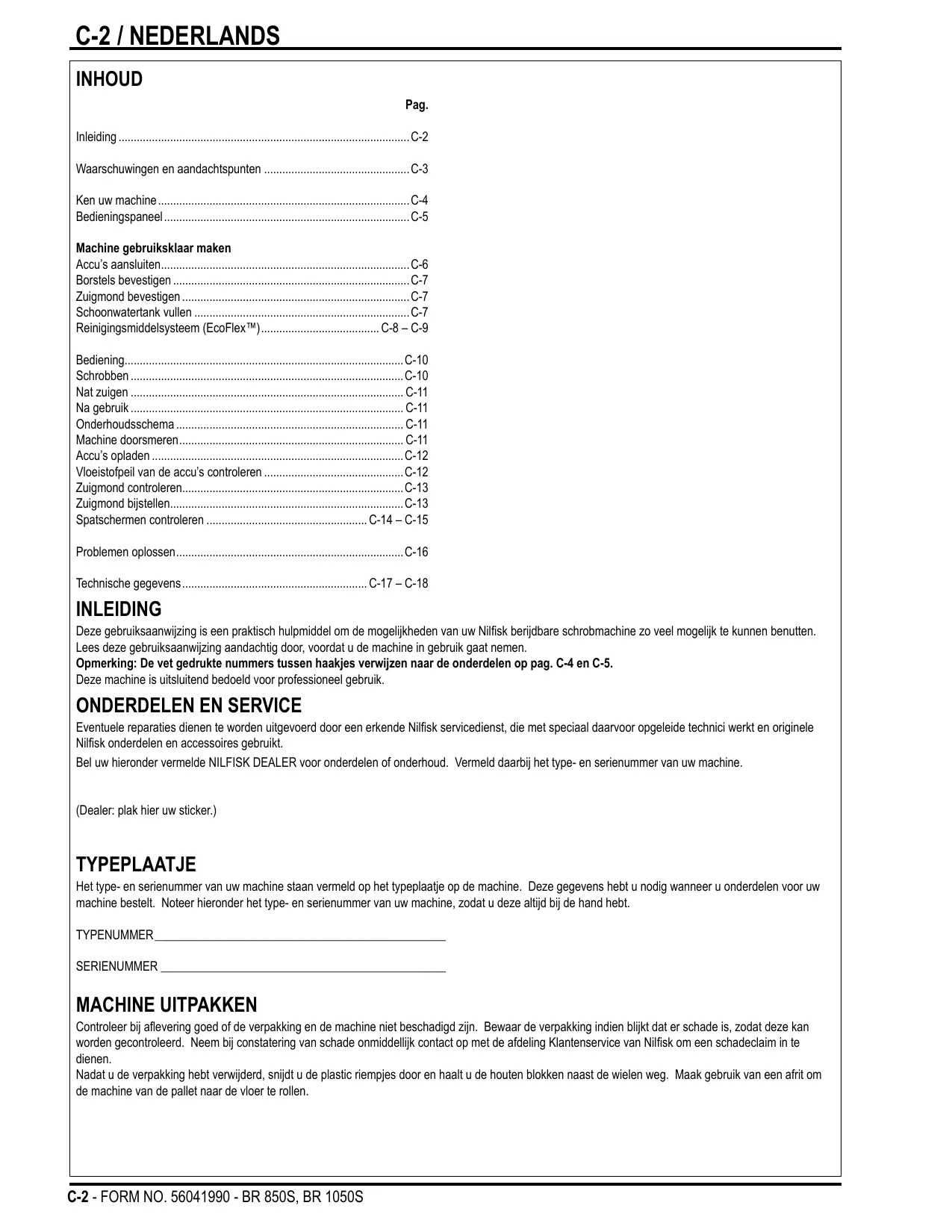 Het type- en serienummer van uw machine staan vermeld op het typeplaatje op de machine. Deze gegevens hebt u nodig wanner u onderdelen voor uw machine bestelt. Noteer hieronder het type- en serienummer van uw machine, zodat u deze algid bij de hand hebt.