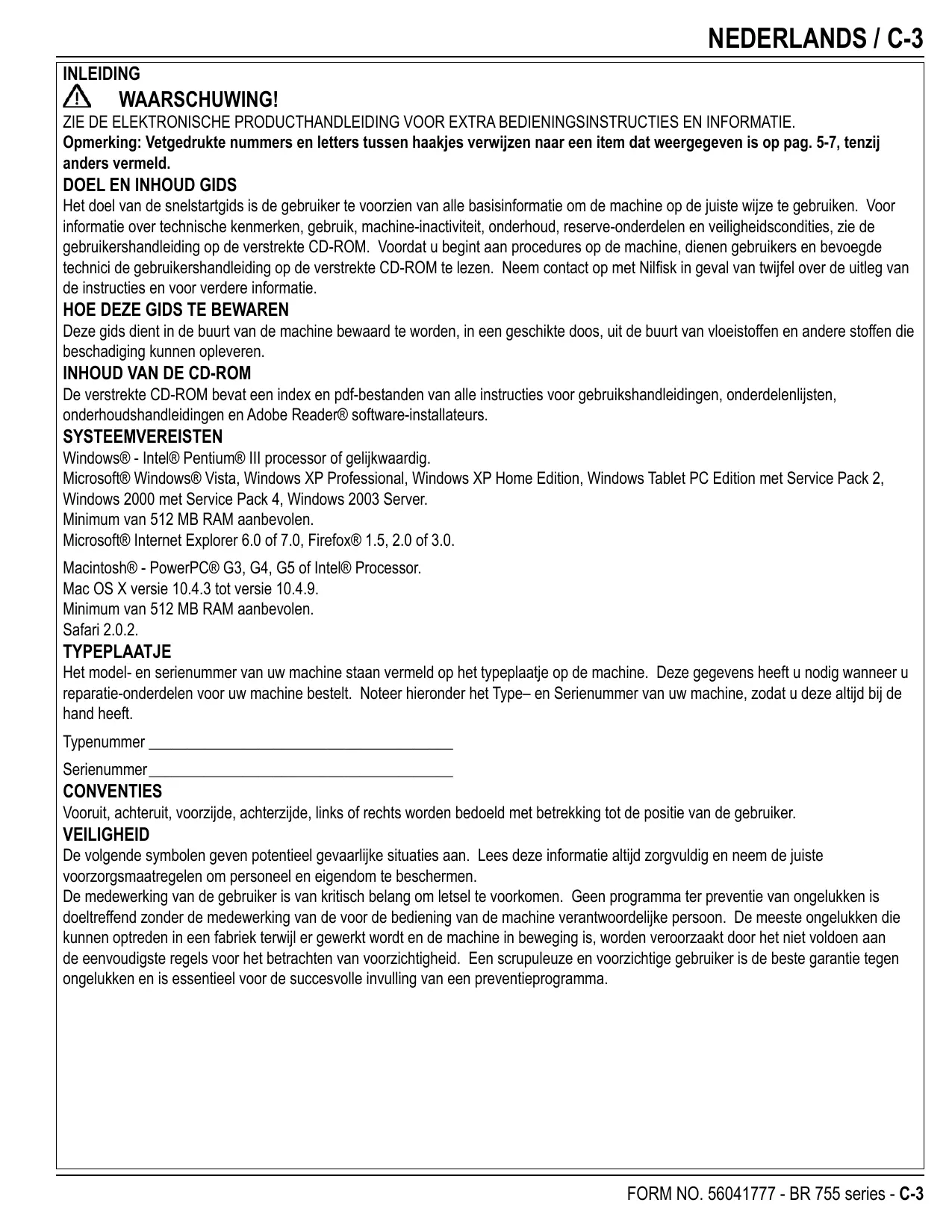 De verstrekte CD-ROM bevat een index en pdf-bestanden van alle instructies voor gebruikshandieidingen, onderdelenlijsten, onderhoudshandleidingen en Adobe Reader® software-installateurs. SYSTEEMVEREISTEN Windows® - Intel® Pentium® 111 processor of gelijkwaardig. Microsoft® Windows® Vista, Windows XP Professional, Windows XP Home Edition, Windows Tablet PC Edition met Service Pack 2, Windows 2000 met Service Pack 4, Windows 2003 Server. Minimum van 512 MB RAM aanbevolen. Microsoft® Internet Explorer 6.0 of 7.0, Firefox® 1.5, 2.0 of 3.0. Macintosh® - PowerPC® G3, G4, G5 of Intel® Processor. Mac OS X versie 10.4.3 tot versie 10.4.9. Minimum van 512 MB RAM aanbevolen. Safari 2.0.2. TYPEPLAATJE Het model- en serienummer van uw machine staan vermeld op het typeplaatje op de machine. Deze gegevens heeft u nodig wanneer u reparatie-onderdelen voor uw machine bestelt. Noteer hieronder het Type- en Serienummer van uw machine, zodat u deze altijd bij de hand heeft. Typenummer Serienummer CONVENTIES Vooruit, achteruit, voorzijde, achterzijde, links of rechts worden bedoeld met betrekking tot de positie van de gebruiker. VEILIGHEID De volgende symbolen geven potentieel gevaarlike situaties aan. Lees deze informatie altijd zorgvuldig en neem de juiste voorzorgsmaatregelen om personeel en eigendom te beschermen. De medewerking van de gebruiker is van kritisch belang om letsel te voorkomen. Geen programma ter preventie van ongelukken is doeltreffend zonder de medewerking van de voor de bediening van de machine verantwoordelijke persoon. De meeste ongelukken die kunnen optreden in een fabriek terwijl er gewerkt wordt en de machine in beweging is, worden veroorzaakt door het niet voldoen aan de eenvoudigste regels voor het betrachten van voorzichtigheid. Een scrupuleuze en voorzichtige gebruiker is de beste garantie tegen ongelukken en is essentieel voor de succesvolle invulling van een preventieprogramma. FORM NO. 56041777 - BR 755 series - C-3