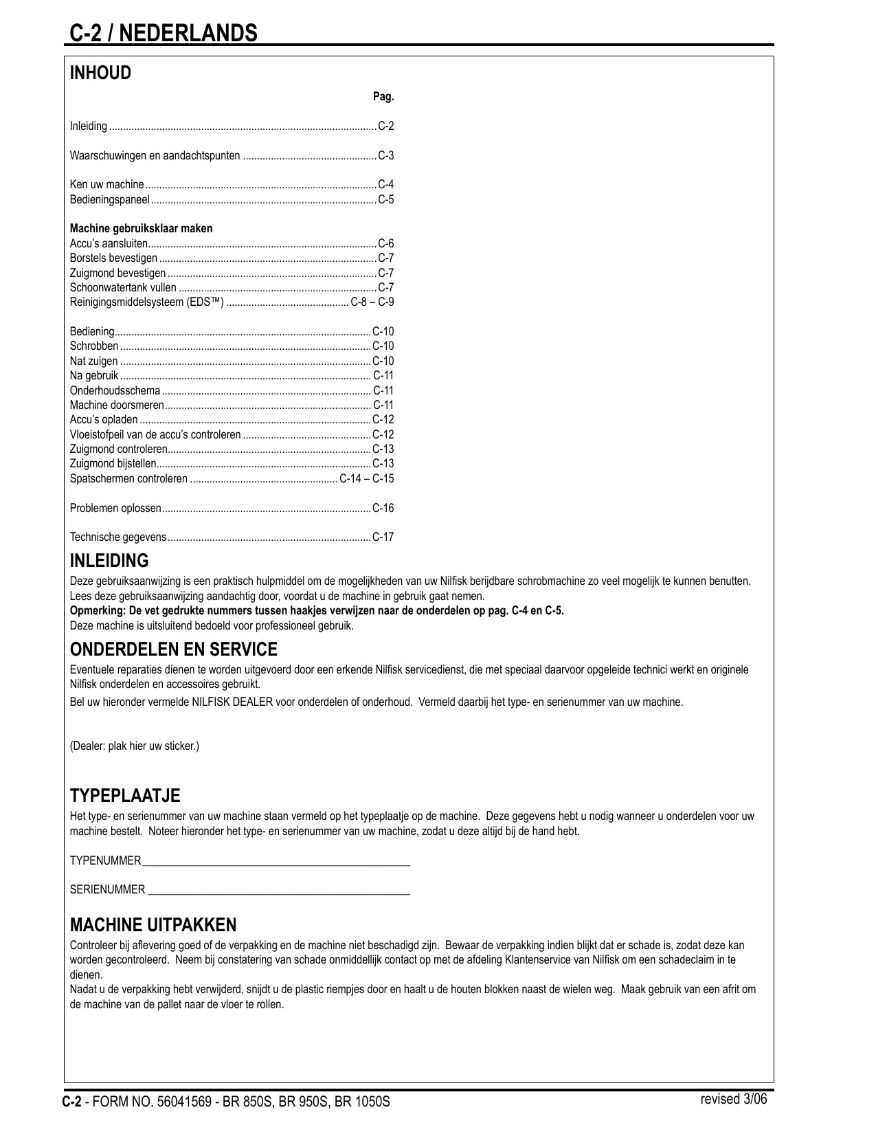 Eventuele reparaties dienen te worden uitgevoerd door een erkende Nilfisk servicedienst, die met speciaal daarvoor opgeleide technici werkt en originele Nilfisk onderdelen en accessoires gebruikt. Bel uw hieronder vermelde NILFISK DEALER voor onderdelen of onderhoud. Vermeld daarbij het type- en serienummer van uw machine. (Dealer: plak hier uw sticker.) TYPEPLAATJE Het type- en serienummer van uw machine staan vermeld op het typeplaatje op de machine. Deze gegevens hebt u nodig wanneer u onderdelen voor uw machine bestelt. Noteer hieronder het type- en serienummer van uw machine, zodat u deze altijd bij de hand hebt. TYPENUMMER ________________________________________________ SERIENUMMER _______________________________________________ MACHINE UITPAKKEN Controleer bij aflevering goed of de verpakking en de machine niet beschadigd zijn. Bewaar de verpakking indien blijkt dat er schade is, zodat deze kan worden gecontroleerd. Neem bij constatering van schade onmiddellijk contact op met de afdeling Klantenservice van Nilfisk om een schadeclaim in te dienen. Nadat u de verpakking hebt verwijderd, snijdt u de plastic riempjes door en haalt u de houten blokken naast de wielen weg. Maak gebruik van een afrit om de machine van de pallet naar de vloer te rollen. C-2 - FORM NO. 56041569 - BR 850S, BR 950S, BR 1050S revised 3/06 NEDERLANDS / C-3