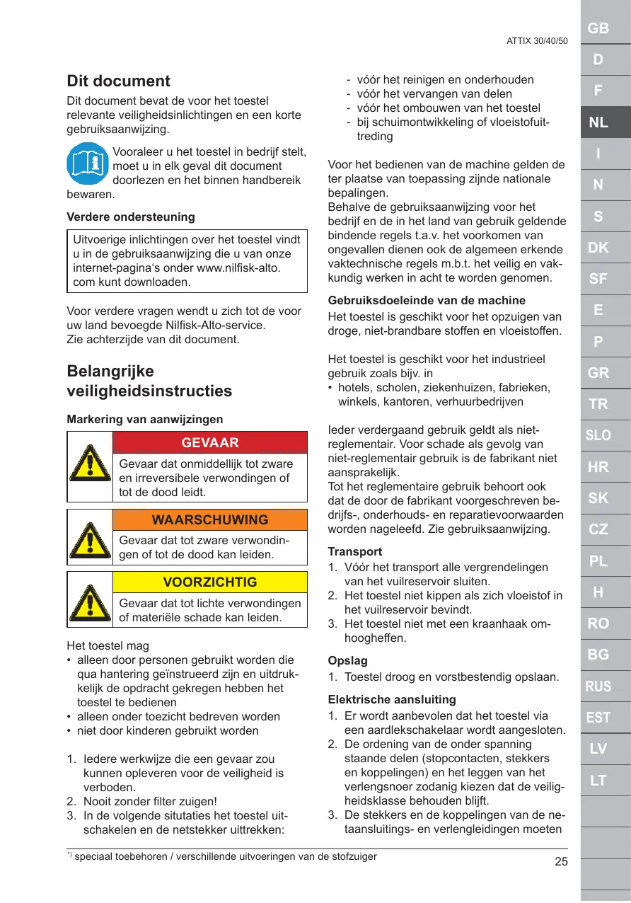 Uitvoerige inlichtingen over het toestel vindt u in de gebruiksaanwijzing die u van onze internet-pagina's onder www.nilfisk-alto. com kunt downloaden.