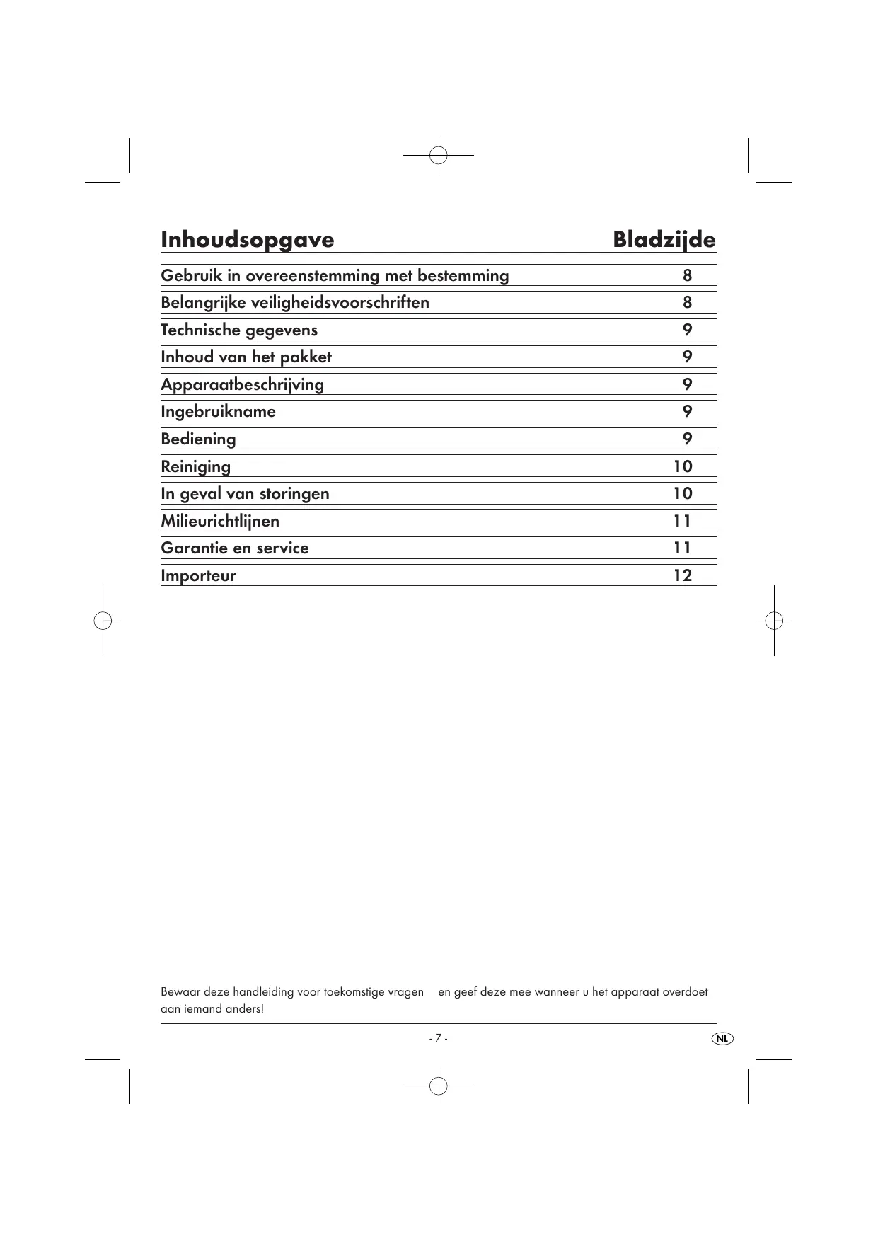 Garantie en service U heeft op dit apparaat 3 jaar garantie vanaf de aankoopdatum. Het apparaat is met de grootst mo gelijke zorg vervaardigd en voorafgaand aan de levering nauwkeurig gecontroleerd. Bewaar a.u.b. de kassabon als aankoopbewijs. Als u aanspraak wilt maken op garantie, neem dan a.u.b. telefonisch contact op met uw servicefiliaal. Alleen op die ma nier is een kostenloze verzending van uw product gegarandeerd. De garantie geldt alleen voor materiaal of fabrica gefouten, echter niet voor transportschade, of voor onderdelen die aan slijtage onderhevig zijn, of voor beschadigingen aan breekbare delen, bijv. schake laars of accu's. Het product is uitsluitend bestemd voor privé gebruik en niet voor bedrijfsmatige doe leinden.