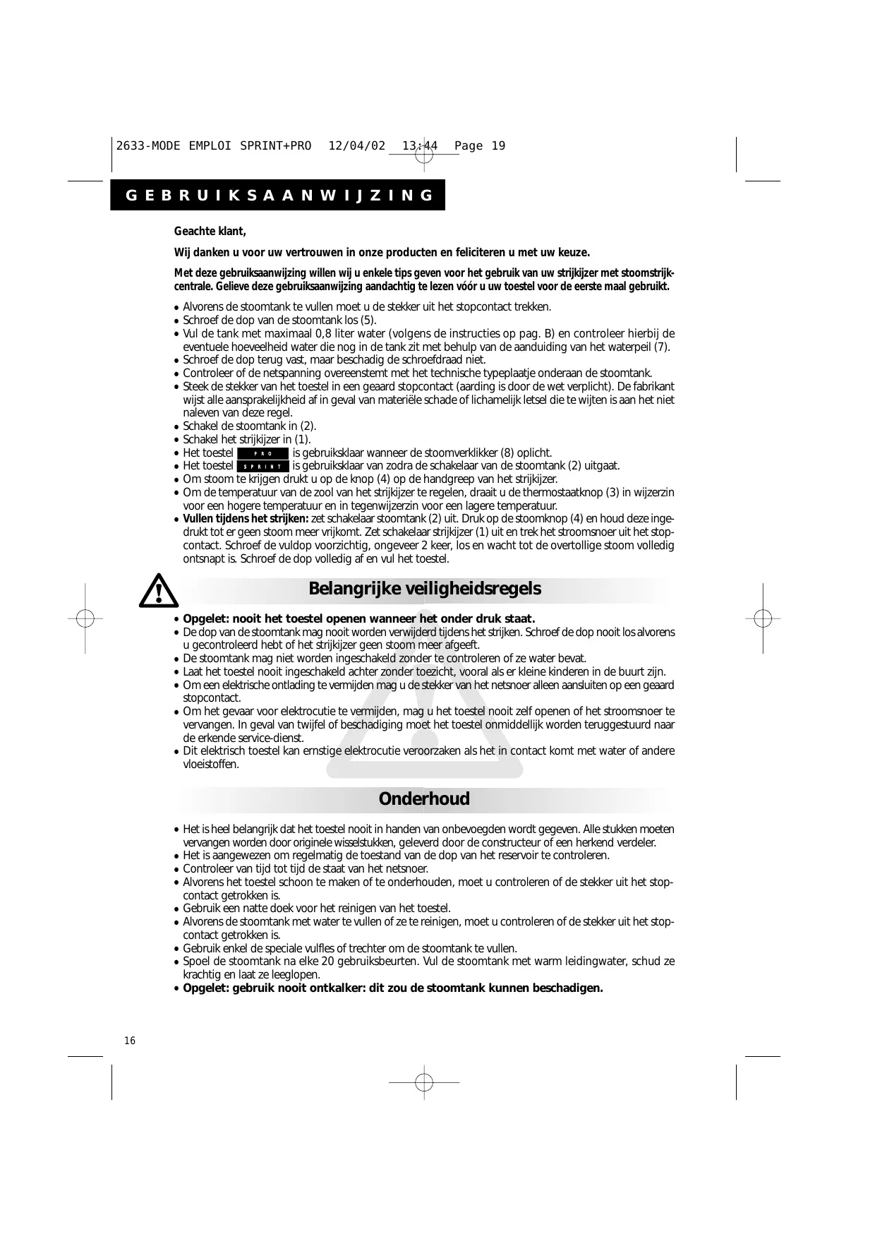 12/04/02 13:44 Page 19 G E B R U I K S A A N W I J Z I N G Geachte klant, Wij danken u voor uw vertrouwen in onze producten en feliciteren u met uw keuze. Met deze gebruiksaanwijzing willen wij u enkele tips geven voor het gebruik van uw strijkijzer met stoomstrijkcentrale. Gelieve deze gebruiksaanwijzing aandachtig te lezen vóór u uw toestel voor de eerste maal gebruikt.
