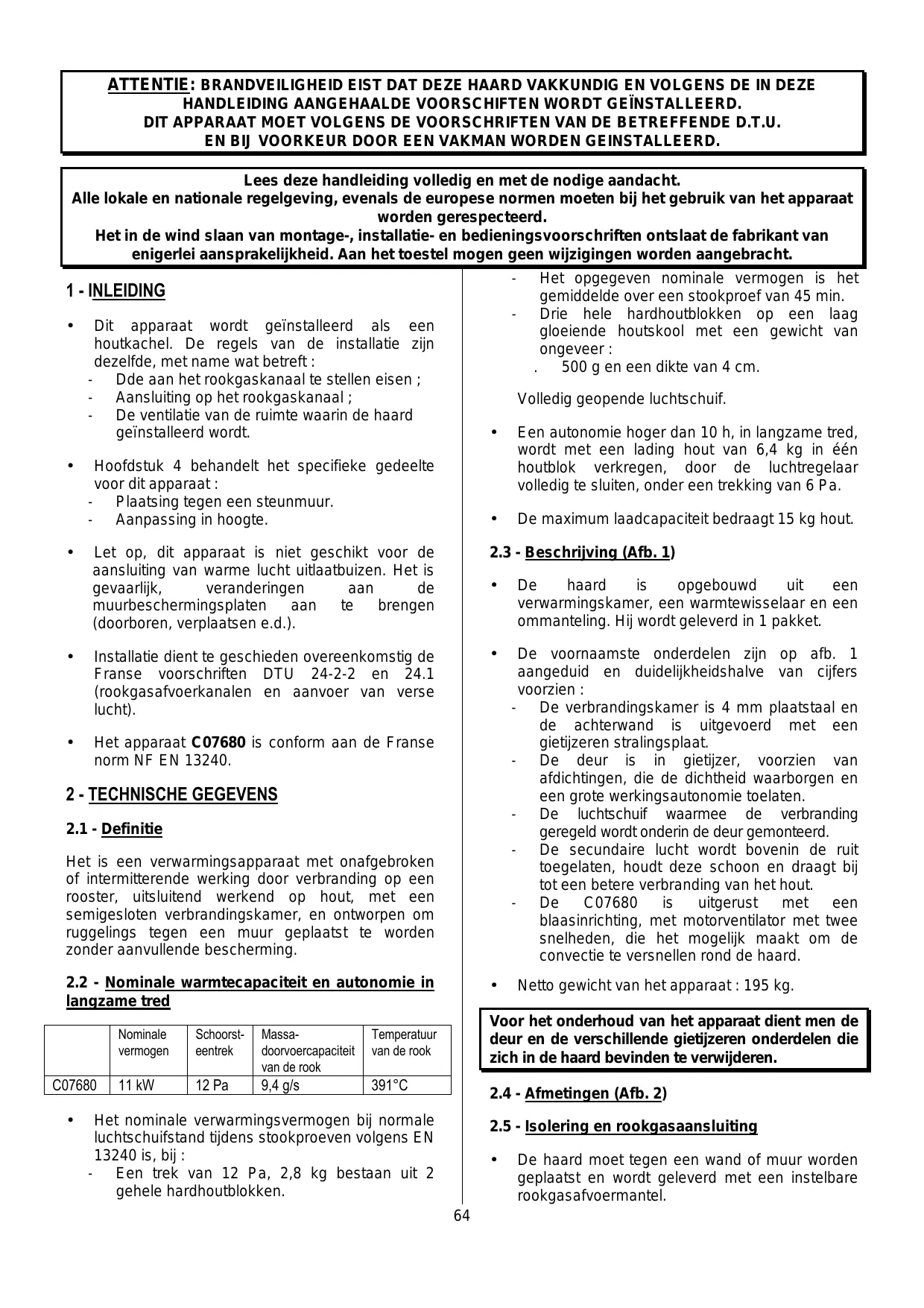 ATTENTIE: BRANDVEILIGHEID EIST DAT DEZE HAARD VAKKUNDIG EN VOLGENS DE IN DEZE HANDLEIDING AANGEHAALDE VOORSCHIFTEN WORDT GEÏNSTALLEERD. DIT APPARAAT MOET VOLGENS DE VOORSCHRIFTEN VAN DE BETREFFENDE D.T.U. EN BIJ VOORKEUR DOOR EEN VAKMAN WORDEN GEINSTALLEERD. Lees deze handleiding volledig en met de nodige aandacht. Alle lokale en nationale regelgeving, evenals de europese normen moeten bij het gebruik van het apparaat worden gerespecteerd. Het in de wind slaan van montage-, installatie- en bedieningsvoorschriften ontslaat de fabrikant van enigerlei aansprakelijkheid. Aan het toestel mogen geen wijzigingen worden aangebracht.