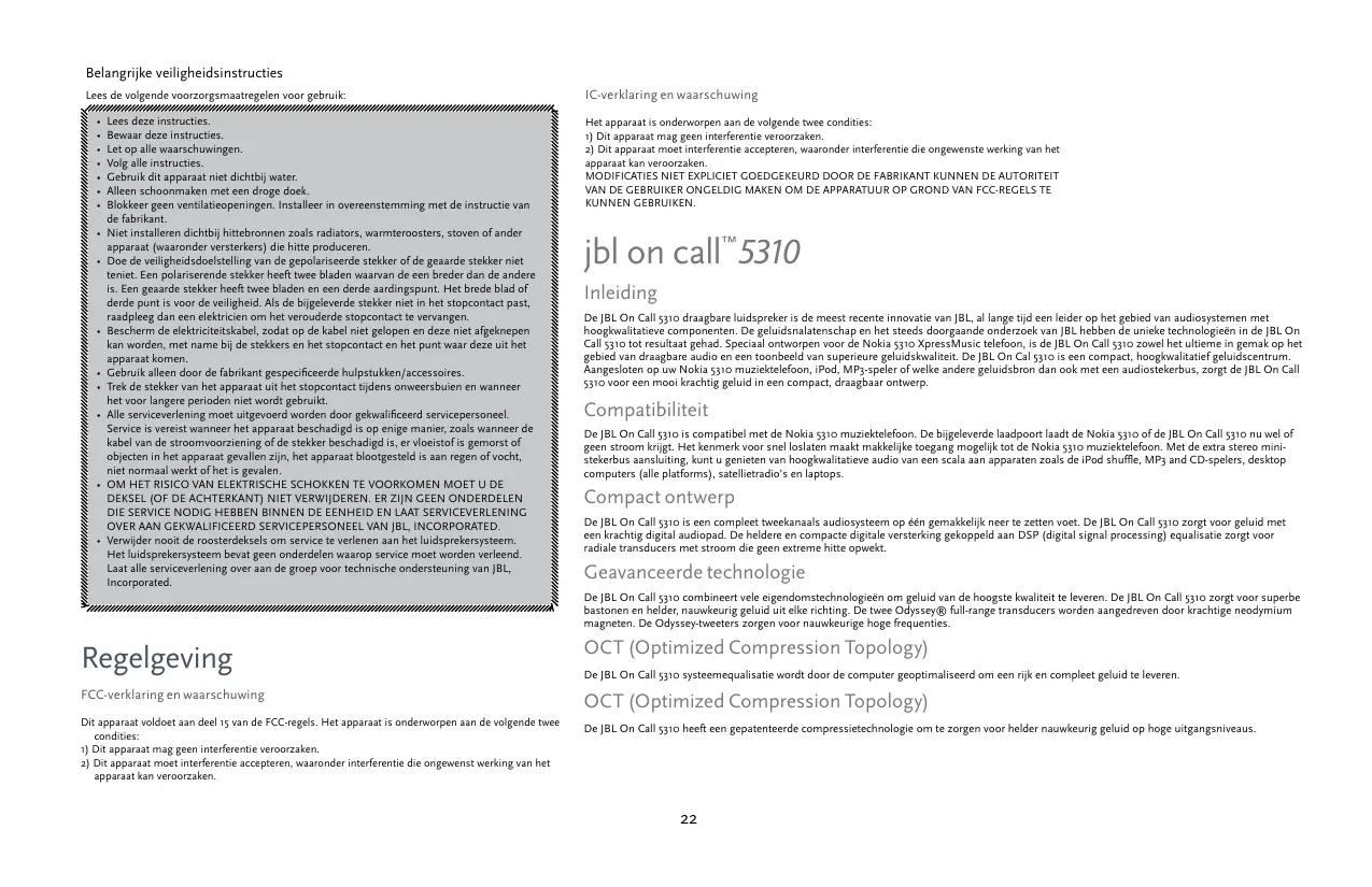 apparaat kan veroorzaken. MODIFICATIES NIET EXPLICIET GOEDGEKEURD DOOR DE FABRIKANT KUNNEN DE AUTORITEIT VAN DE GEBRUIKER ONGELDIG MAKEN OM DE APPARATUUR OP GROND VAN FCC-REGELS TE KUNNEN GEBRUIKEN. jbl on call™5310 Inleiding De JBL On Call 5310 draagbare luidspreker is de meest recente innovatie van JBL, al lange tijd een leider op het gebied van audiosystemen met hoogkwalitatieve componenten. De geluidsnalatenschap en het steeds doorgaande onderzoek van JBL hebben de unieke technologieën in de JBL On Call 5310 tot resultaat gehad. Speciaal ontworpen voor de Nokia 5310 XpressMusic telefoon, is de JBL On Call 5310 zowel het ultieme in gemak op het gebied van draagbare audio en een toonbeeld van superieure geluidskwaliteit. De JBL On Cal 5310 is een compact, hoogkwalitatief geluidscentrum. Aangesloten op uw Nokia 5310 muziektelefoon, iPod, MP3-speler of welke andere geluidsbron dan ook met een audiostekerbus, zorgt de JBL On Call 5310 voor een mooi krachtig geluid in een compact, draagbaar ontwerp. Compatibiliteit De JBL On Call 5310 is compatibel met de Nokia 5310 muziektelefoon. De bijgeleverde laadpoort laadt de Nokia 5310 of de JBL On Call 5310 nu wel of geen stroom krijgt. Het kenmerk voor snel loslaten maakt makkelijke toegang mogelijk tot de Nokia 5310 muziektelefoon. Met de extra stereo ministekerbus aansluiting, kunt u genieten van hoogkwalitatieve audio van een scala aan apparaten zoals de iPod shuffle, MP3 and CD-spelers, desktop computers (alle platforms), satellietradio’s en laptops. Compact ontwerp De JBL On Call 5310 is een compleet tweekanaals audiosysteem op één gemakkelijk neer te zetten voet. De JBL On Call 5310 zorgt voor geluid met een krachtig digital audiopad. De heldere en compacte digitale versterking gekoppeld aan DSP (digital signal processing) equalisatie zorgt voor radiale transducers met stroom die geen extreme hitte opwekt. Geavanceerde technologie De JBL On Call 5310 combineert vele eigendomstechnologieën om geluid van de hoogste kwaliteit te leveren. De JBL On Call 5310 zorgt voor superbe bastonen en helder, nauwkeurig geluid uit elke richting. De twee Odyssey® full-range transducers worden aangedreven door krachtige neodymium magneten. De Odyssey-tweeters zorgen voor nauwkeurige hoge frequenties. Regelgeving OCT (Optimized Compression Topology) FCC-verklaring en waarschuwing OCT (Optimized Compression Topology) Dit apparaat voldoet aan deel 15 van de FCC-regels. Het apparaat is onderworpen aan de volgende twee condities: