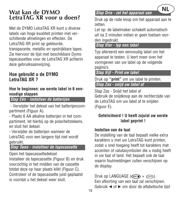 Druk op de rode knop om het apparaat aan te zetten. Let op: de labelmaker schakelt automatisch uit na 2 minuten indien er geen toetsen worden ingedrukt. Stap Vier - typ een label Met de DYMO LetraTAG XR kunt u diverse labels van hoge kwaliteit printen met verschillende afmetingen en effecten. De LetraTAG XR print op gekleurde, transparante, metallic en opstrijkbare tapes. Zie hiervoor de lijst met beschikbare Dymo tapecassettes voor de LetraTAG XR achterin deze gebruiksaanwijzing. Typ allereerst een eenvoudig label om het apparaat te testen. U leert meer over het vormgeven van uw label op de volgende pagina’s. Stap Vijf - Print uw label Hoe gebruikt u de DYMO LetraTAG XR ? Druk op “print” om uw label te printen. Stap Zes - snijd uw label af Hoe te beginnen: uw eerste label in 6 eenvoudige stappen Stap Eén - installeer de batterijen Stap Zes - Snijd het label af Gebruik de snijdknop aan de rechterzijde van de LetraTAG om uw label af te snijden (Figuur E). - Verwijder het deksel van het batterijencompartiment (Figuur A). - Plaats 6 AA alkaline batterijen in het compartiment, let hierbij op de polariteitstekens, en sluit het deksel. - Verwijder de batterijen wanneer de LetraTAG voor een langere tijd niet wordt gebruikt. Stap Twee - installeer de tapecassette Gefeliciteerd ! U heeft zojuist uw eerste label geprint ! Instellen van de taal De instelling van de taal bepaalt welke extra karakters u met uw LetraTAG kunt printen, zodat u snel toegang heeft tot karakters met accenten of valutasymbolen die u nodig heeft in uw taal of land. Het bepaalt ook de taal waarin foutmeldingen zullen verschijnen op de display. Open het tapecassettedeksel. Installeer de tapecassette (Figuur B) en druk voorzichtig in het midden van de cassette totdat deze op haar plaats klikt (Figuur C). Controleer of de tapecassette juist geplaatst is voordat u het deksel weer sluit. Druk op LANGUAGE ( + CAPS ). Een afkorting van een taal zal verschijnen. Gebruik Q of R om door de alfabetische lijst SHIFT