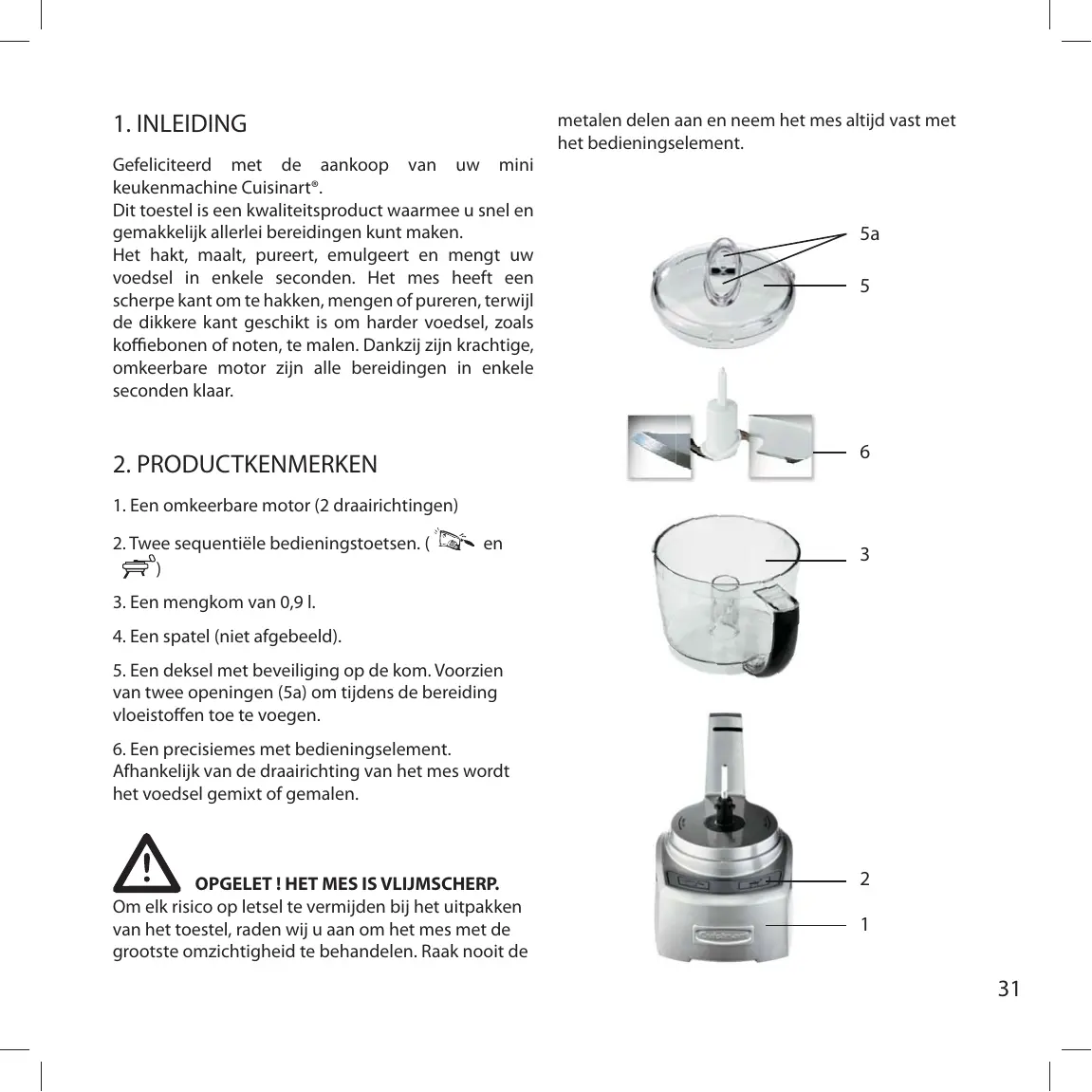 Gefeliciteerd met de aankoop van uw mini keukenmachine Cuisinart®. Dit toestel is een kwaliteitsproduct waarmee u snel en gemakkelijk allerlei bereidingen kunt maken. Het hakt, maalt, pureert, emulgeert en mengt uw voedsel in enkele seconden. Het mes heeft een scherpe kant om te hakken, mengen of pureren, terwijl de dikkere kant geschikt is om harder voedsel, zoals koffiebonen of noten, te malen. Dankzij zijn krachtige, omkeerbare motor zijn alle bereidingen in enkele seconden klaar.
