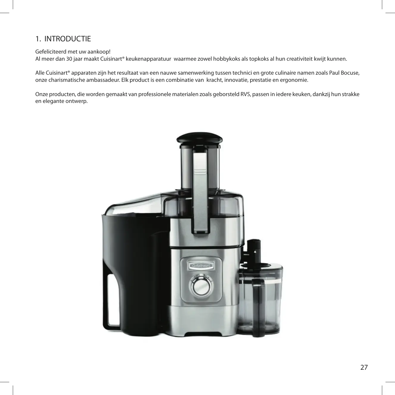Gefeliciteerd met uw aankoop! Al meer dan 30 jaar maakt Cuisinart® keukenapparatuur waarmee zowel hobbykoks als topkoks al hun creativiteit kwijt kunnen. Alle Cuisinart® apparaten zijn het resultaat van een nauwe samenwerking tussen technici en grote culinaire namen zoals Paul Bocuse, onze charismatische ambassadeur. Elk product is een combinatie van kracht, innovatie, prestatie en ergonomie. Onze producten, die worden gemaakt van professionele materialen zoals geborsteld RVS, passen in iedere keuken, dankzij hun strakke en elegante ontwerp.