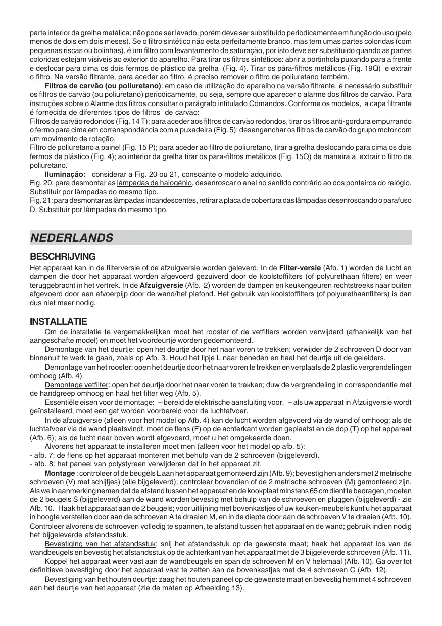 draai-beweging. Poly-urethaan wand-filter (Afb. 15P); om het filter in poly-urethaan te bereiken, het rooster wegnemen door de 2 klemmen in plastic (Afb. 4) naar boven te verplaatsen; aan de binnenkant van het rooster de metalen filter-klemmen (Afb. 15Q) oplichten zodat het filter in poly-urethaan vrijkomt. Verlichting: raadpleeg afb. 20 of afb. 21, afhankelijk van het door u aangeschafte model. Afb. 20: voor het demonteren van de halogeenlampjes, schroef de ringmoer tegen de klok in los. Vervang hen door lampjes van hetzelfde type. Afb. 21: voor het demonteren van gloei-lampjes, verwijder de lampenkap door de schroef D los te draaien. Vervangen door lampjes van hetzelfde type.