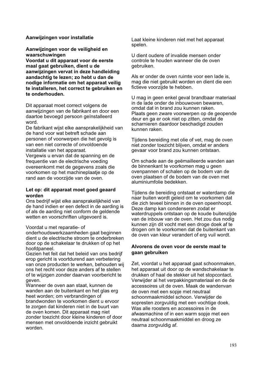 Aanwijzingen voor installatie Aanwijzingen voor de veiligheid en waarschuwingen Voordat u dit apparaat voor de eerste maal gaat gebruiken, dient u de aanwijzingen vervat in deze handleiding aandachtig te lezen; zo hebt u dan de nodige informatie om het apparaat veilig te installeren, het correct te gebruiken en te onderhouden. Dit apparaat moet correct volgens de aanwijzingen van de fabrikant en door een daartoe bevoegd persoon geïnstalleerd word. De fabrikant wijst elke aansprakelijkheid van de hand voor wat betreft schade aan personen of voorwerpen die het gevolg is van een niet correcte of onvoldoende installatie van het apparaat. Vergewis u ervan dat de spanning en de frequentie van de electrische voeding overeenkomt met de gegevens zoals die voorkomen op het machineplaatje op de rand aan de voorzijde van de oven. Let op: dit apparaat moet goed geaard worden Ons bedrijf wijst elke aansprakelijkheid van de hand indien er een defect in de aarding is of als de aarding niet conform de geldende wetten en voorschriften uitgevoerd is. Voordat u met reparatie- of onderhoudswerkzaamheden gaat beginnen dient u de electrische stroom te onderbreken door op de schakelaar te drukken of op het hoofdpaneel. Gezien het feit dat het beleid van ons bedrijf erop gericht is voortdurend aan verbetering van onze producten te werken, behouden wij ons het recht voor deze anders af te stellen of te wijzigen zonder daarvan voorbericht te geven. Wanneer de oven aan staat, kunnen de wanden aan de buitenkant en het glas erg heet worden; om verbrandingen of brandwonden te voorkomen dient u ervoor te zorgen dat kinderen niet in de buurt van de oven komen. Dit apparaat mag niet zonder toezicht door kleine kinderen of door mensen met onvoldoende inzicht gebruikt worden. Laat kleine kinderen niet met het apparaat spelen. U dient oudere of invalide mensen onder controle te houden wanneer die de oven gebruiken. Als er onder de oven ruimte voor een lade is, mag die niet gebruikt worden en dient die een fictieve voorzijde te hebben. U mag in geen enkel geval brandbaar materiaal in de lade onder de inbouwoven bewaren, omdat dat in brand zou kunnen raken. Plaats geen zware voorwerpen op de geopende deur en ga er ook niet op zitten, omdat de scharnieren daardoor beschadigd zouden kunnen raken. Tijdens bereiding met olie of vet, mag de oven niet zonder toezicht blijven, omdat er anders gevaar voor brand zou kunnen ontstaan. Om schade aan de geëmailleerde wanden aan de binnenkant te voorkomen mag u geen ovenpannen of schalen op de bodem van de oven plaatsen of de bodem van de oven met aluminiumfolie bedekken. Tijdens de bereiding ontstaat er waterdamp die naar buiten wordt geleid om te voorkomen dat die zich teveel binnen in de oven opeenhoopt. Deze damp kan condenseren zodat er waterdruppels ontstaan op de koude buitenzijde van de inbouw van de oven. Het zou dus nodig kunnen zijn dit vocht met een droge doek af te drogen om te voorkomen dat de buitenkant van de oven van kleur verandert of erg vuil wordt. Alvorens de oven voor de eerste maal te gaan gebruiken Zet, voordat u het apparaat gaat schoonmaken, het apparaat uit door op de wandschakelaar te drukken of haal de stekker uit het stopcontact. Verwijder al het verpakkingsmateriaal en de de accessoires uit de oven. Maak de wandenvan de oven met een sopje met neutraal schoonmaakmiddel schoon. Verwijder de sopresten zorgvuldig met een vochtige doek. Was alle roosters en accessoires in de afwasmachine of in een warm sopje met een neutraal schoonmaakmiddel en droog ze daarna zorgvuldig af.
