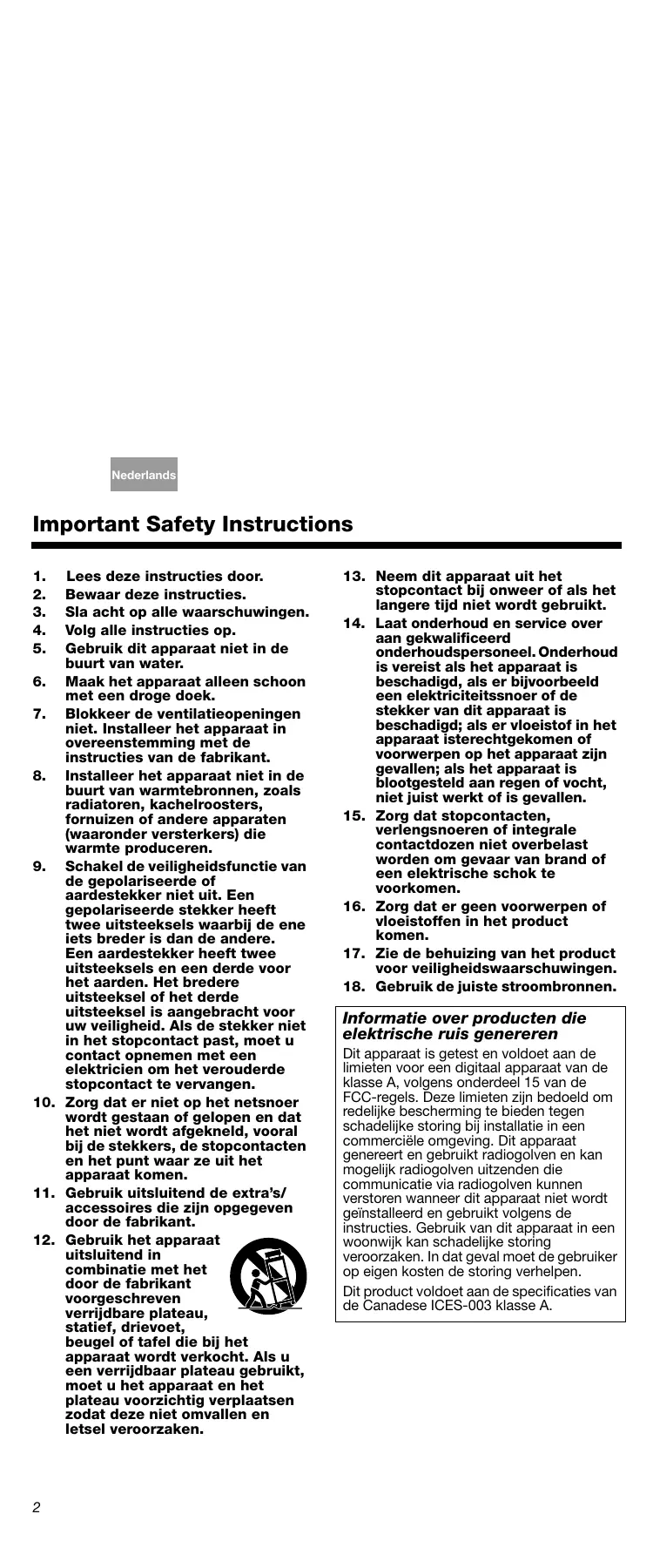 Lees deze instructies door. Bewaar deze instructies. Sla acht op alle waarschuwingen. Volg alle instructies op. Gebruik dit apparaat niet in de buurt van water.