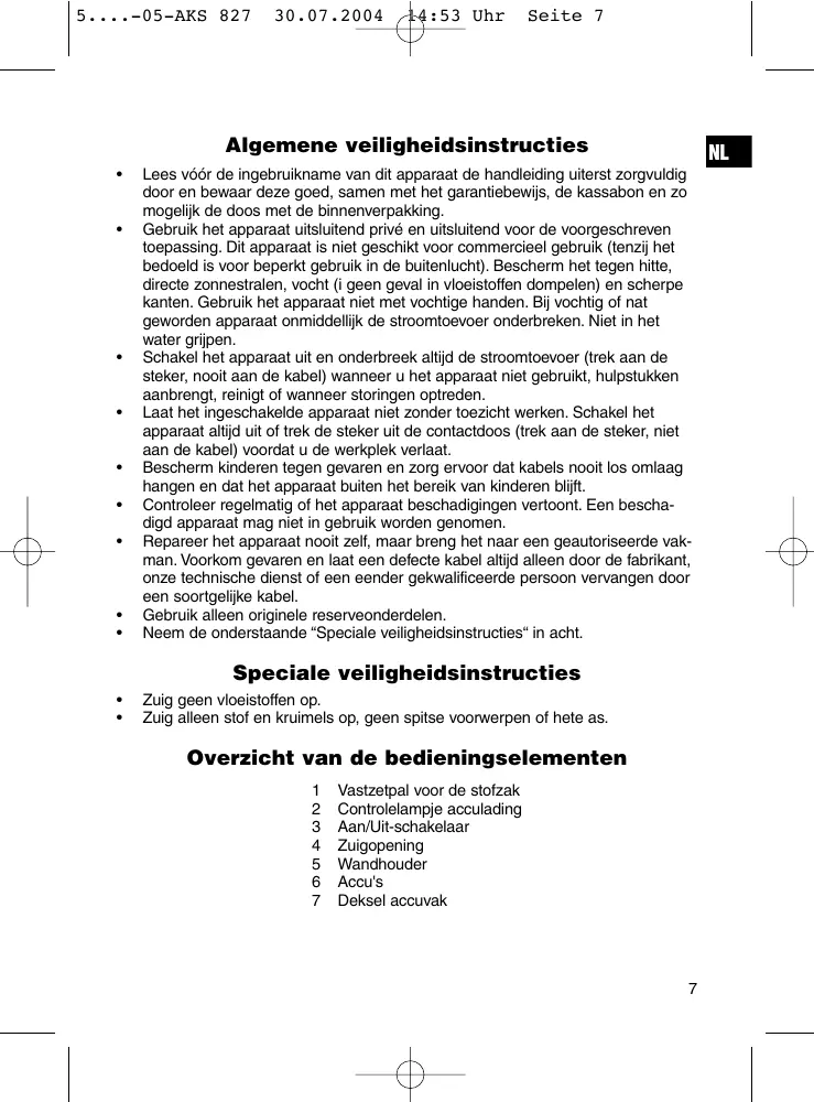 Zuig geen vloeistoffen op. Zuig alleen stof en kruimels op, geen spitse voorwerpen of hete as.