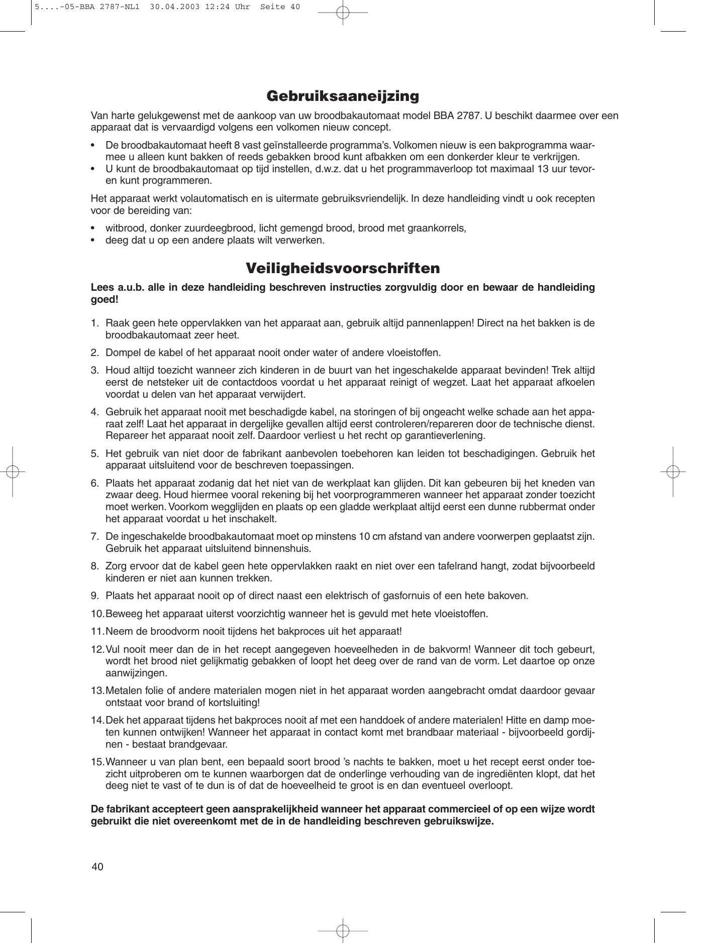 Gebruiksaaneijzing Van harte gelukgewenst met de aankoop van uw broodbakautomaat model BBA 2787. U beschikt daarmee over een apparaat dat is vervaardigd volgens een volkomen nieuw concept. • •