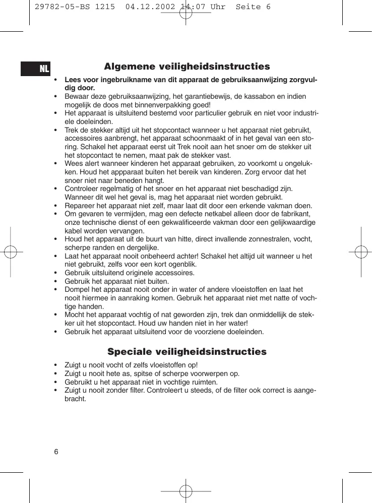 Zuigt u nooit vocht of zelfs vloeistoffen op! Zuigt u nooit hete as, spitse of scherpe voorwerpen op. Gebruikt u het apparaat niet in vochtige ruimten. Zuigt u nooit zonder filter. Controleert u steeds, of de filter ook correct is aangebracht.