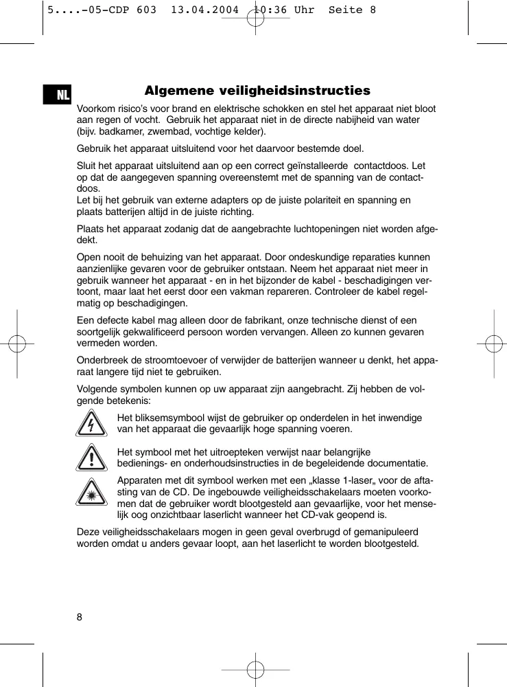 Apparaten met dit symbolwerken met een „klass 1-laser_, voor de aftsting van de CD. De ingebouwde veilighidesschakelaars要去en voorkomen dat de gebruiker wordt blootgesteld aan gevaarlijke, voor het menselijk oog onzichtbaar laserlicht wanneer het CD-vak geopend is.