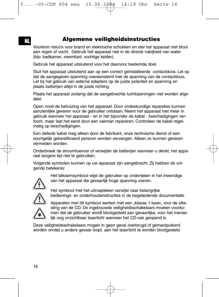 Apparaten met dit symbool werken met een „klasse 1-laser_, voor de aftsting van de CD. De ingebouwde veilgheidsschakelaars要去en voorkomen dat de gebruiker worden blootgesteld aan gaervaarlijke, voor het menselijk oog onzichtbaar laserlicht wonneer het CD-vak geopend is.