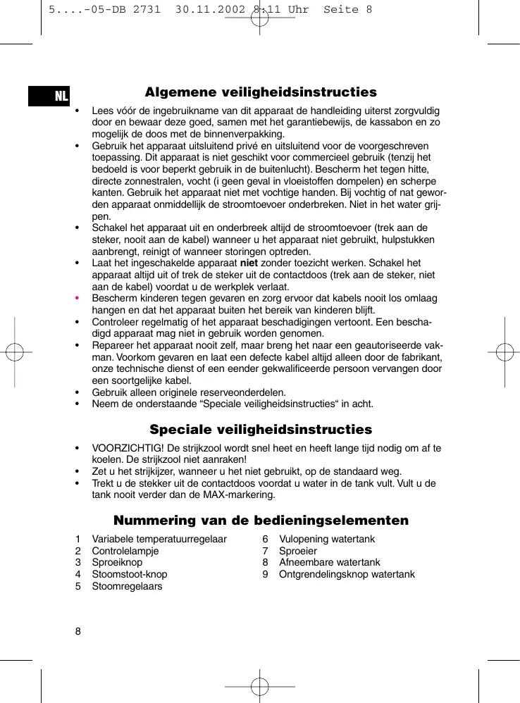 VOORZICHTIG! De strijkzool wordt snel heet en heeft lange tijd nodig om af te koelen. De strijkzool niet aanraken! Zet u het strijkijzer, wanneer u het niet gebruikt, op de standaard weg. Trekt u de stekker uit de contactdoos voordat u water in de tank vult. Vult u de tank nooit verder dan de MAX-markering.