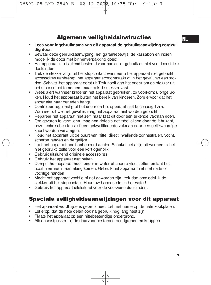 - Laat het apparaat nooit onbeheerd zichter! Schakel het altijd uit wanner u het Niet gebruikt, zichs voor een kort ogenblick.