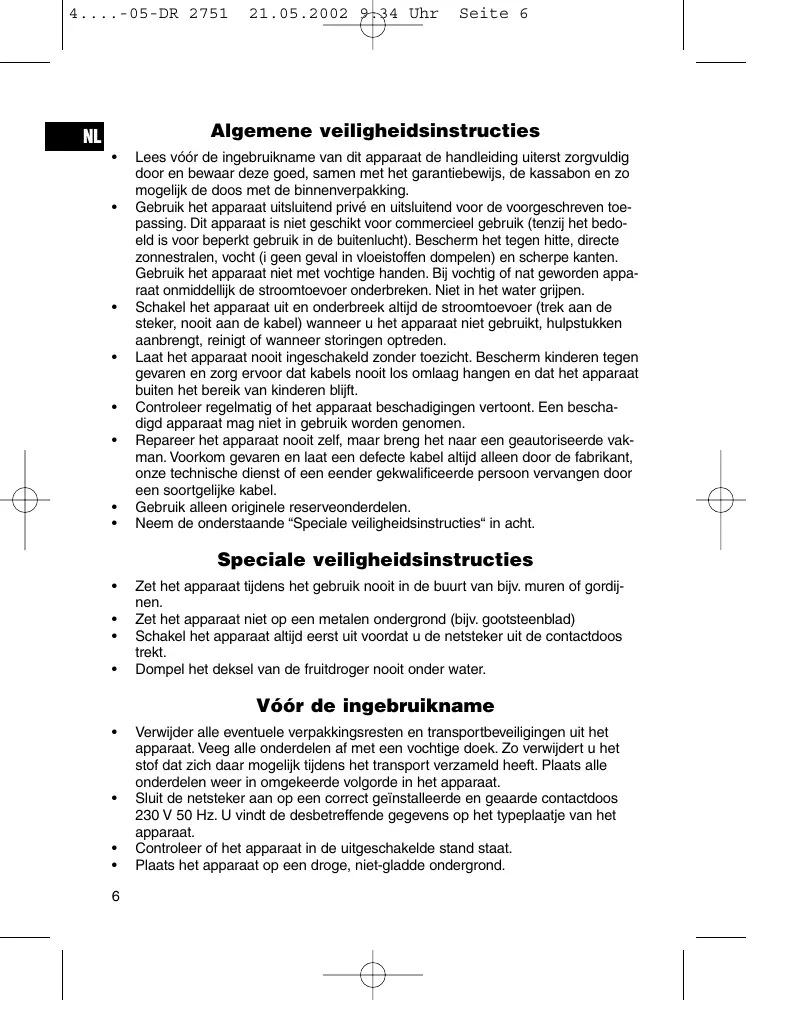 Zet het apparaat tijdens het gebruik nooit in de buurt van bijv. muren of gordijnen. Zet het apparaat niet op een metalen ondergrond (bijv. gootsteenblad) Schakel het apparaat altijd eerst uit voordat u de netsteker uit de contactdoos trekt. Dompel het deksel van de fruitdroger nooit onder water. Vóór de ingebruikname