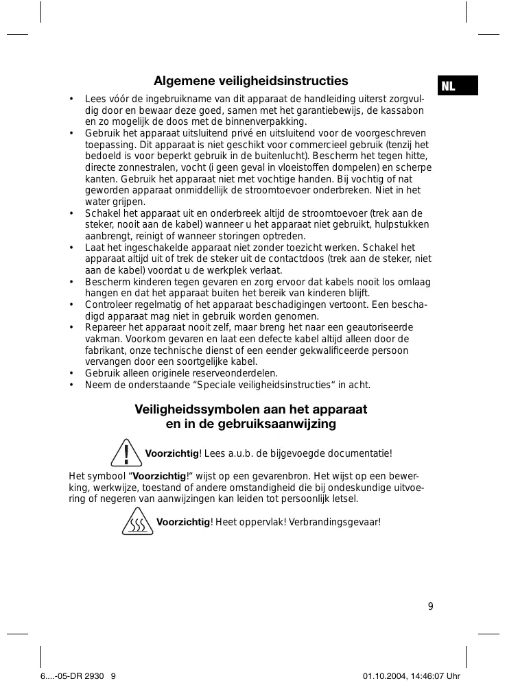 Lees vóór de ingebruikname van dit apparaat de handleiding uiterst zorgvuldig door en bewaar deze goed, samen met het garantiebewijs, de kassabon en zo mogelijk de doos met de binnenverpakking. Gebruik het apparaat uitsluitend privé en uitsluitend voor de voorgeschreven toepassing. Dit apparaat is niet geschikt voor commercieel gebruik (tenzij het bedoeld is voor beperkt gebruik in de buitenlucht). Bescherm het tegen hitte, directe zonnestralen, vocht (i geen geval in vloeistoffen dompelen) en scherpe kanten. Gebruik het apparaat niet met vochtige handen. Bij vochtig of nat geworden apparaat onmiddellijk de stroomtoevoer onderbreken. Niet in het water grijpen. Schakel het apparaat uit en onderbreek altijd de stroomtoevoer (trek aan de steker, nooit aan de kabel) wanneer u het apparaat niet gebruikt, hulpstukken aanbrengt, reinigt of wanneer storingen optreden. Laat het ingeschakelde apparaat niet zonder toezicht werken. Schakel het apparaat altijd uit of trek de steker uit de contactdoos (trek aan de steker, niet aan de kabel) voordat u de werkplek verlaat. Bescherm kinderen tegen gevaren en zorg ervoor dat kabels nooit los omlaag hangen en dat het apparaat buiten het bereik van kinderen blijft. Controleer regelmatig of het apparaat beschadigingen vertoont. Een beschadigd apparaat mag niet in gebruik worden genomen. Repareer het apparaat nooit zelf, maar breng het naar een geautoriseerde vakman. Voorkom gevaren en laat een defecte kabel altijd alleen door de fabrikant, onze technische dienst of een eender gekwalificeerde persoon vervangen door een soortgelijke kabel. Gebruik alleen originele reserveonderdelen. Neem de onderstaande “Speciale veiligheidsinstructies“ in acht. Veiligheidssymbolen aan het apparaat en in de gebruiksaanwijzing Voorzichtig! Lees a.u.b. de bijgevoegde documentatie! Het symbool “Voorzichtig!“ wijst op een gevarenbron. Het wijst op een bewerking, werkwijze, toestand of andere omstandigheid die bij ondeskundige uitvoering of negeren van aanwijzingen kan leiden tot persoonlijk letsel. Voorzichtig! Heet oppervlak! Verbrandingsgevaar!