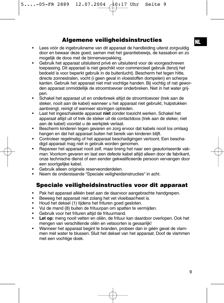 Pak het apparaat alléén beet aan de daarvoor aangebrachte handgrepen. Beweeg het apparaat niet zolang het vet vloeibaar/heet is. Houd het deksel (1) tijdens het frituren goed gesloten. Vul de mand (8) buiten de frituurpan om spatten te vermijden. Gebruik voor het frituren altijd de frituurmand. Let op: meng nooit vetten en oliën, de frituur kan daardoor overlopen. Ook het mengen van verschillende oliën en vetsoorten is gevaarlijk! Wanneer het apparaat begint te branden, probeer dan in géén geval de vlammen met water te blussen. Sluit het deksel van het apparaat. Doof de vlammen met een vochtige doek.