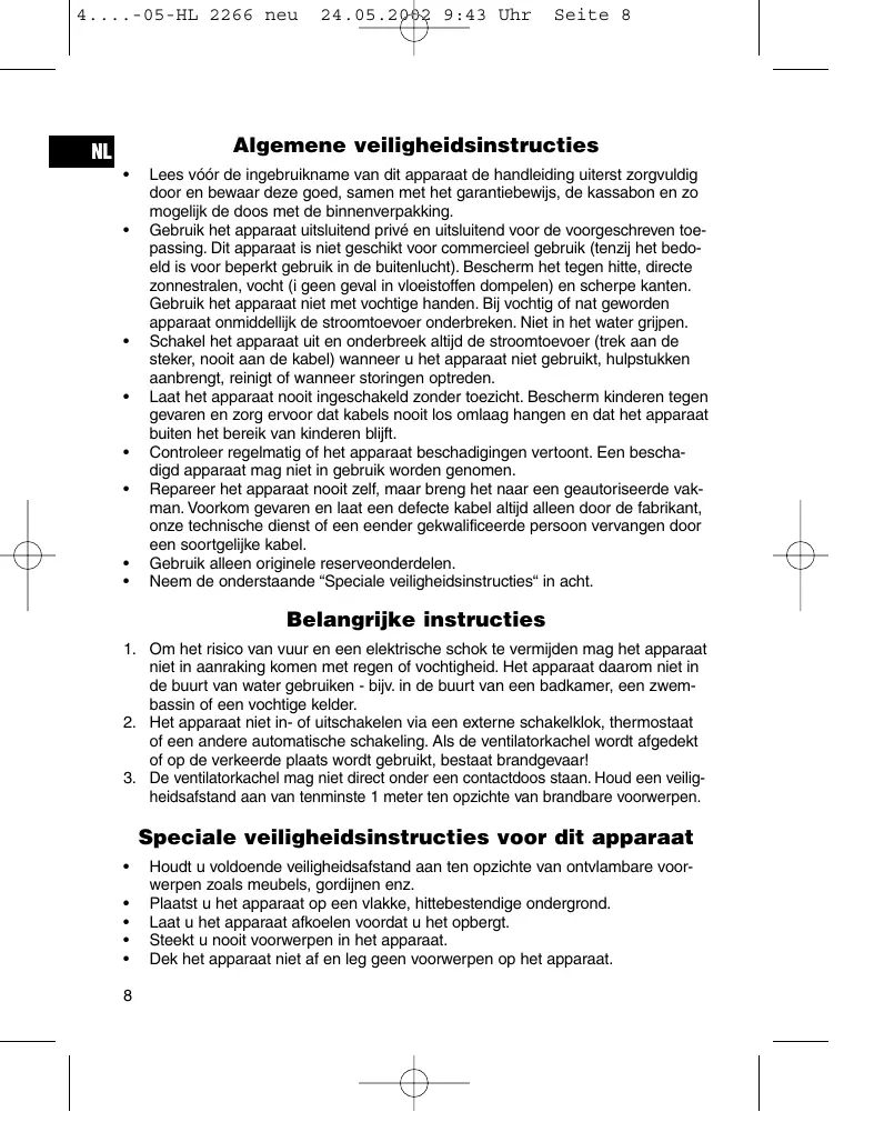 - De ventilatorkachel mag Niet direct onder een contactdoos staan. Houd een veiligheidsafstand aan van tenminste 1 meter ten opzichte van brandbare voorwerpen.