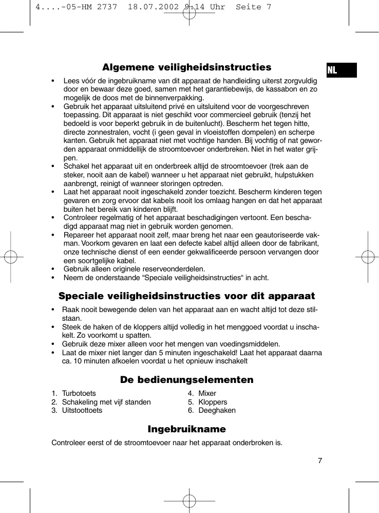 Raak nooit bewegende delen van het apparaat aan en wacht altijd tot deze stilstaan. Steek de haken of de kloppers altijd volledig in het menggoed voordat u inschakelt. Zo voorkomt u spatten. Gebruik deze mixer alleen voor het mengen van voedingsmiddelen. Laat de mixer niet langer dan 5 minuten ingeschakeld! Laat het apparaat daarna ca. 10 minuten afkoelen voordat u het opnieuw inschakelt De bedienungselementen