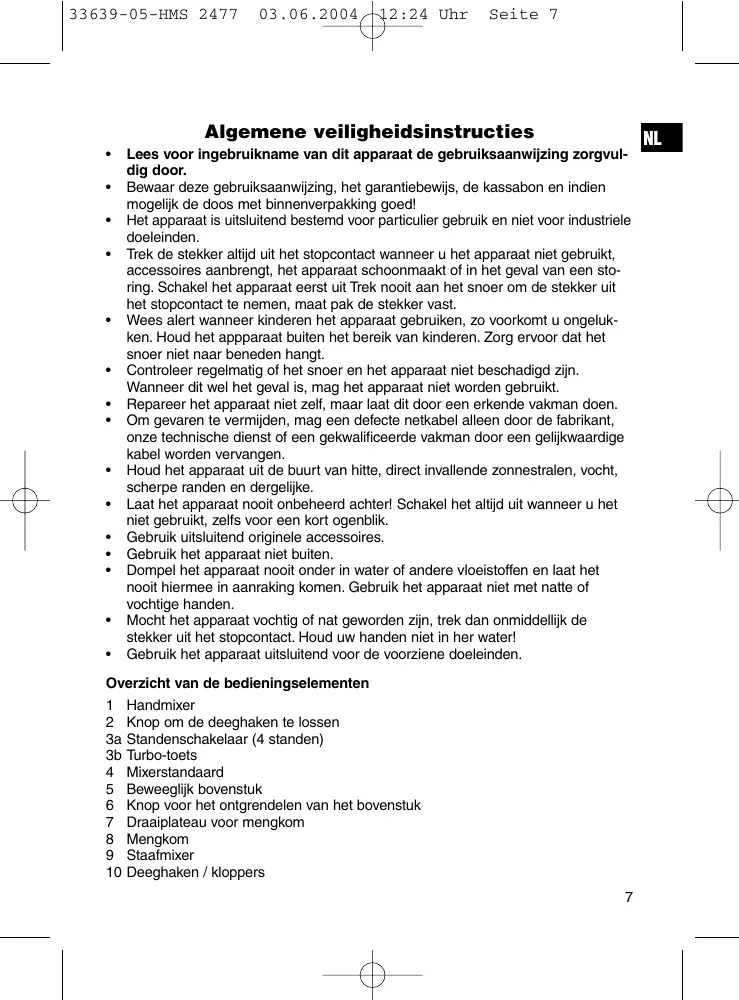 Lees voor ingebruikname van dit apparaat de gebruiksaanwijzing zorgvuldig door. Bewaar deze gebruiksaanwijzing, het garantiebewijs, de kassabon en indien mogelijk de doos met binnenverpakking goed! Het apparaat is uitsluitend bestemd voor particulier gebruik en niet voor industriele doeleinden. Trek de stekker altijd uit het stopcontact wanneer u het apparaat niet gebruikt, accessoires aanbrengt, het apparaat schoonmaakt of in het geval van een storing. Schakel het apparaat eerst uit Trek nooit aan het snoer om de stekker uit het stopcontact te nemen, maat pak de stekker vast. Wees alert wanneer kinderen het apparaat gebruiken, zo voorkomt u ongelukken. Houd het appparaat buiten het bereik van kinderen. Zorg ervoor dat het snoer niet naar beneden hangt. Controleer regelmatig of het snoer en het apparaat niet beschadigd zijn. Wanneer dit wel het geval is, mag het apparaat niet worden gebruikt. Repareer het apparaat niet zelf, maar laat dit door een erkende vakman doen. Om gevaren te vermijden, mag een defecte netkabel alleen door de fabrikant, onze technische dienst of een gekwalificeerde vakman door een gelijkwaardige kabel worden vervangen. Houd het apparaat uit de buurt van hitte, direct invallende zonnestralen, vocht, scherpe randen en dergelijke. Laat het apparaat nooit onbeheerd achter! Schakel het altijd uit wanneer u het niet gebruikt, zelfs voor een kort ogenblik. Gebruik uitsluitend originele accessoires. Gebruik het apparaat niet buiten. Dompel het apparaat nooit onder in water of andere vloeistoffen en laat het nooit hiermee in aanraking komen. Gebruik het apparaat niet met natte of vochtige handen. Mocht het apparaat vochtig of nat geworden zijn, trek dan onmiddellijk de stekker uit het stopcontact. Houd uw handen niet in her water! Gebruik het apparaat uitsluitend voor de voorziene doeleinden. Overzicht van de bedieningselementen