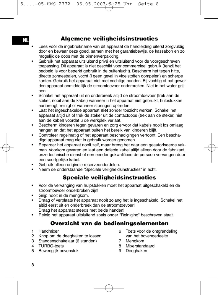 mixer van het bovengedeelte (5) van de mixstandaard te scheiden. Kies voor het gebruik een hulpstuk en een snelheid volgens onderstaande tabel: Product/bereidingswijze max. Hoeveelheid Zwaar deeg (bijv. gistdeeg) 500 g Roerdeeg 750 g Biscuitdeeg, wafelbeslag, Slagroom 750 g Hulpstuk deeghaken kloppers kloppers Stand 1 -4 2 -5 2 -5 of Turbo Max. arbeidsdur 3 min 5 min 5 min Reiniging