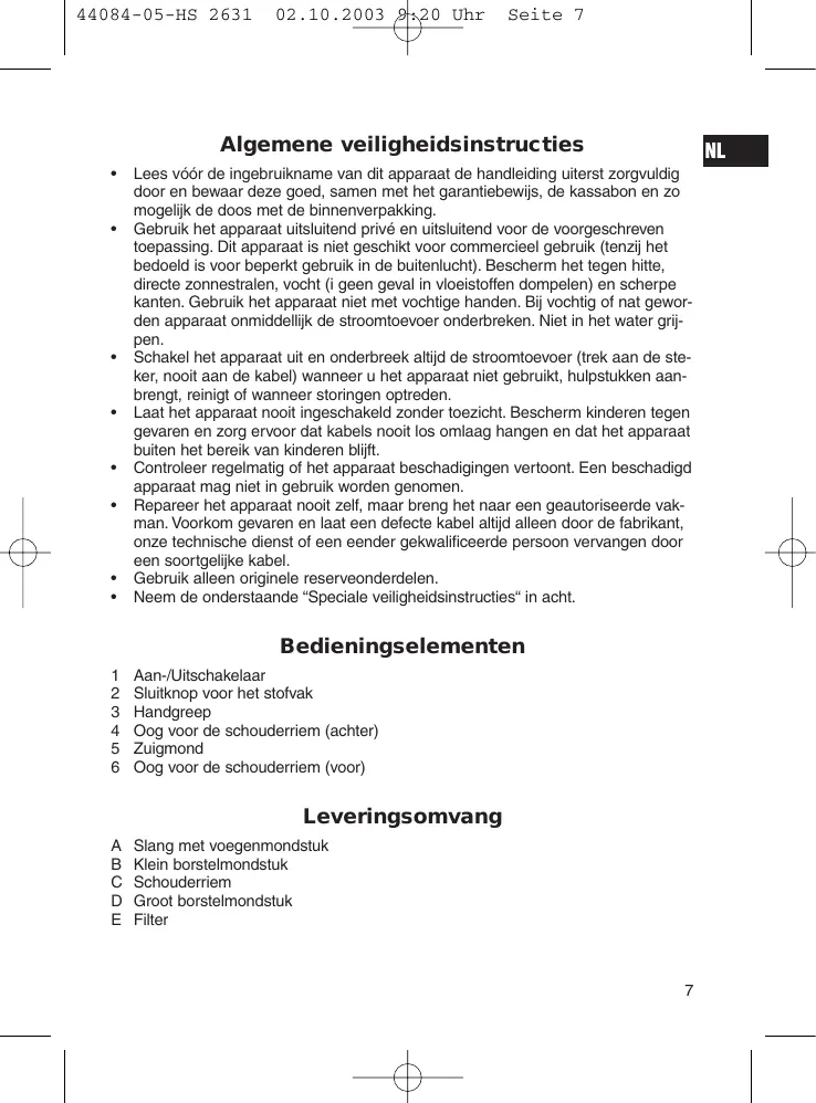 Slang met voegenmondstuk Klein borstelmondstuk Schouderriem Groot borstelmondstuk Filter